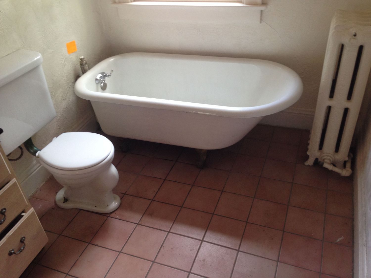 The main bath is, mostly, original. I would install classic subway tiles on the lower walls, and find a pedestal sink. Oh, and a white octagon tile floor is needed! STAT!