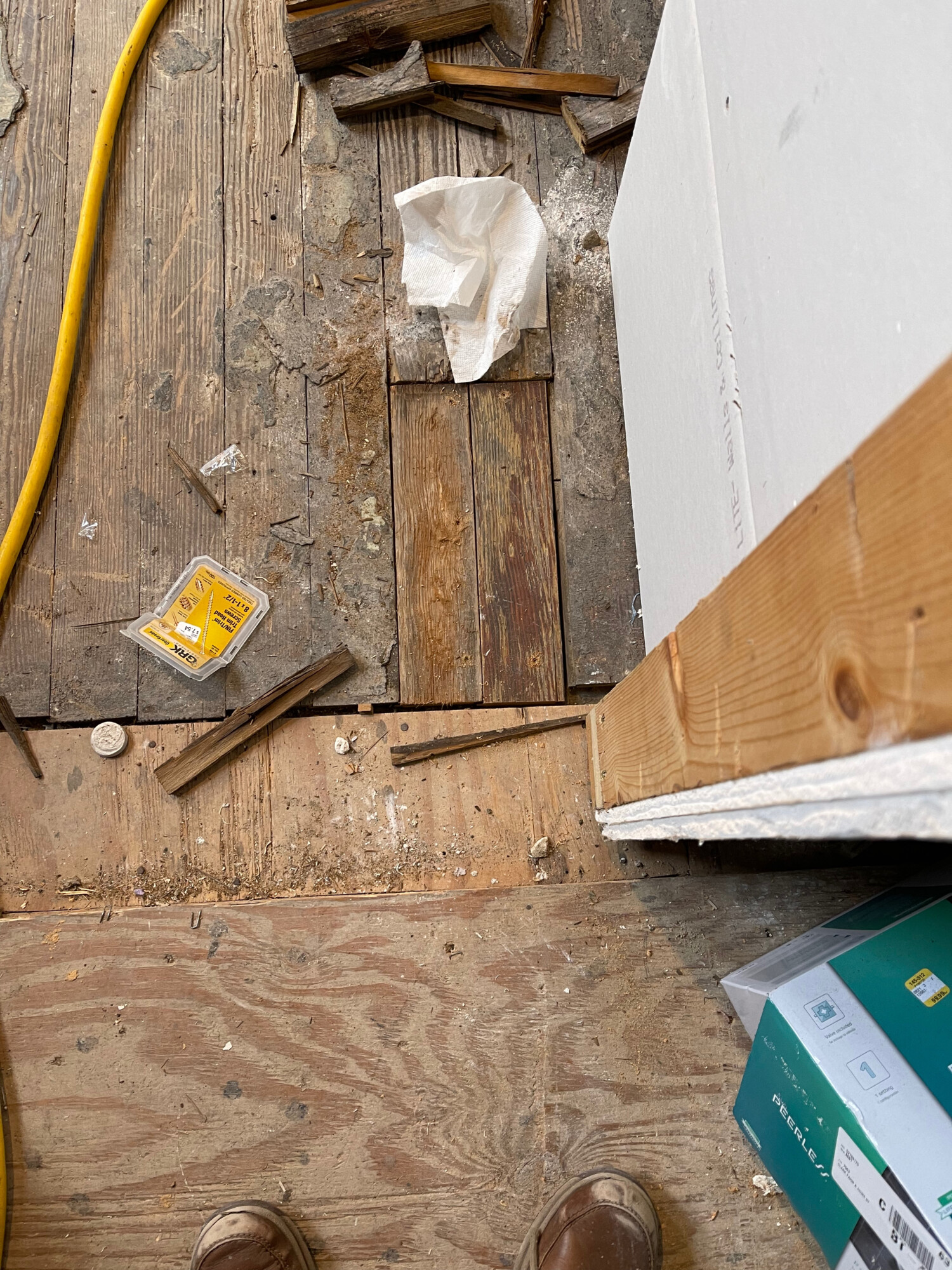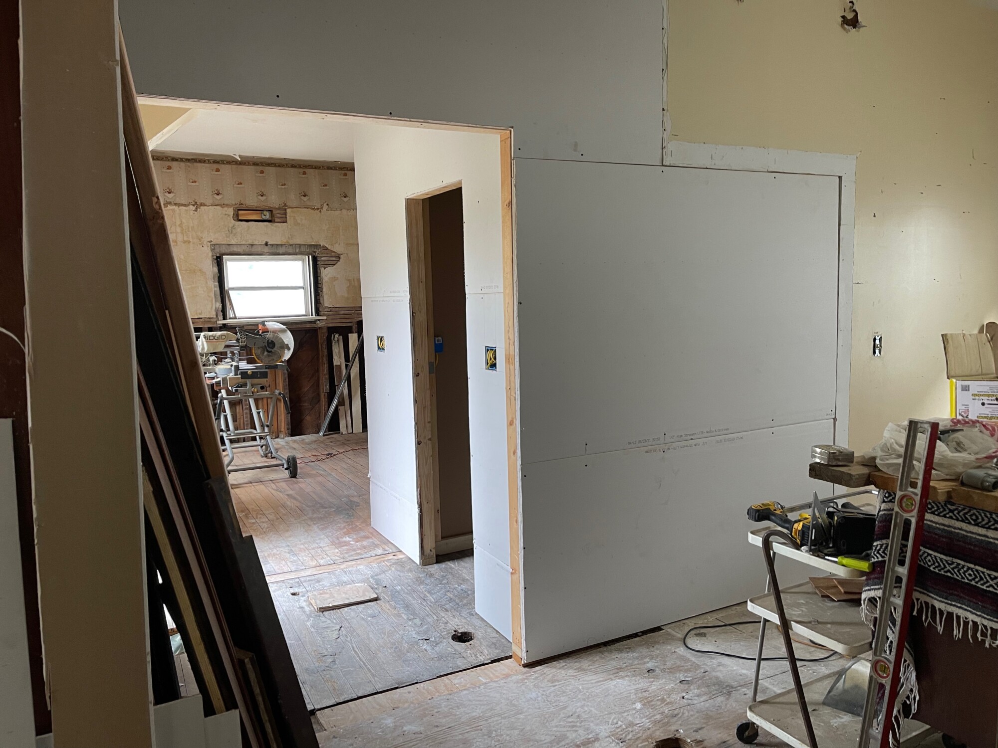 2021. Looking from the dining room into the kitchen. In the foreground is plywood. Then the original circa-1921 floor from the former pantry. Then the circa-1921 kitchen floor, which I revealed several years ago.