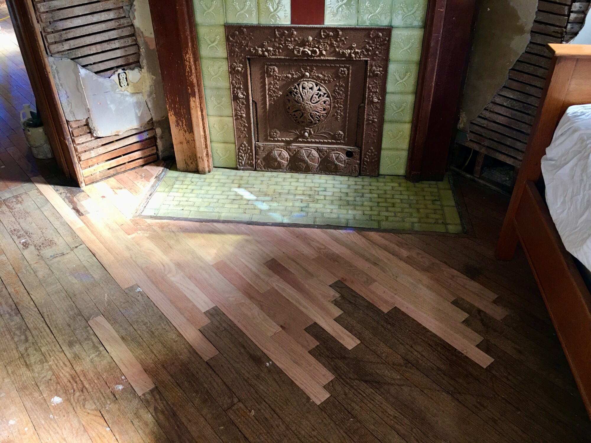 In the Octagon Bedroom, a huge radiator along the east wall had failed (due to a cracked pipe just under the flooring) and the single remaining low radiator in the octagon bay could not possibly have heated the room.