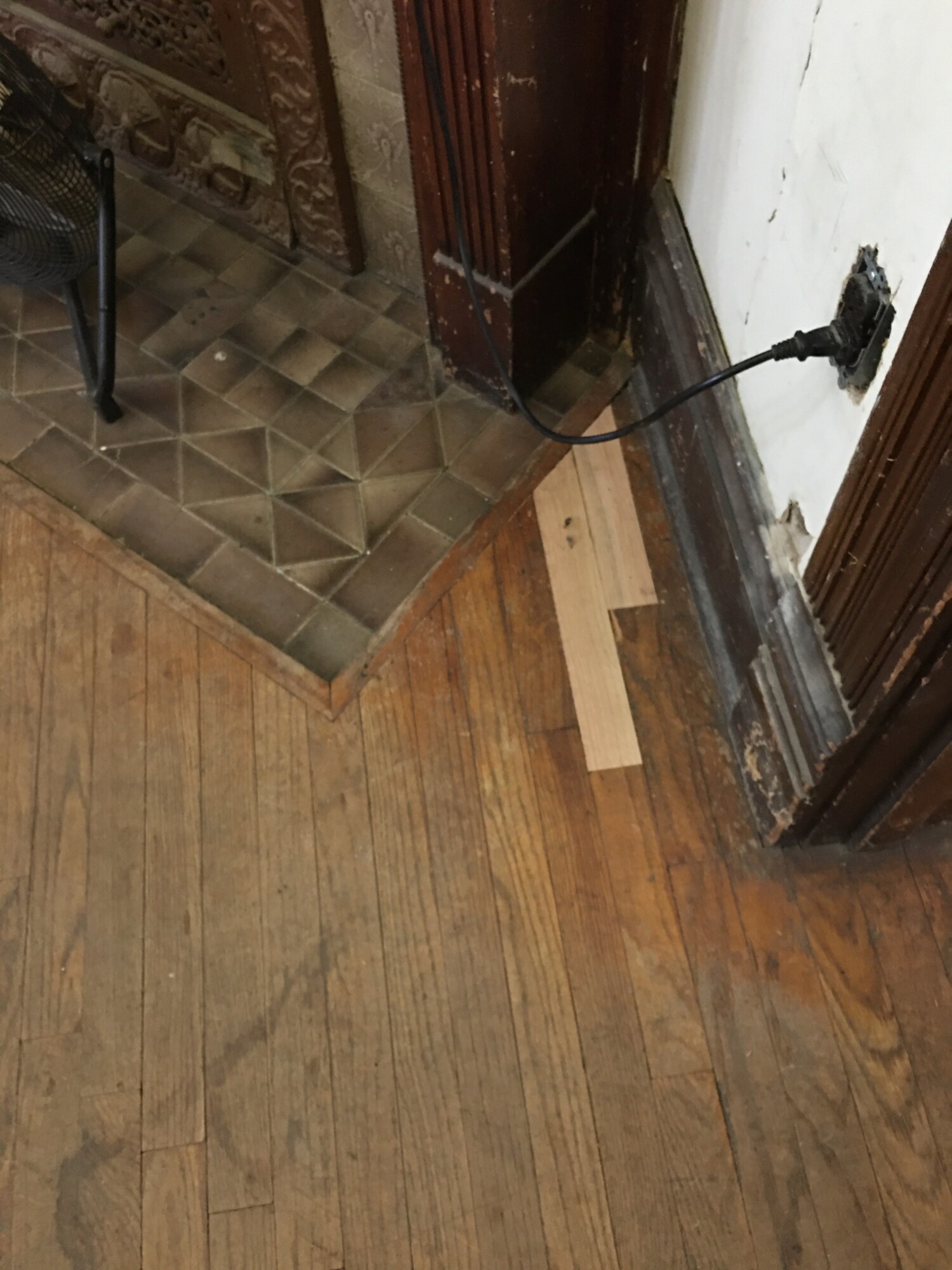 Adjacent to the fireplace was non-original gas pipe sticking out from the floor. It, too, has been vanquished and the flooring infilled.