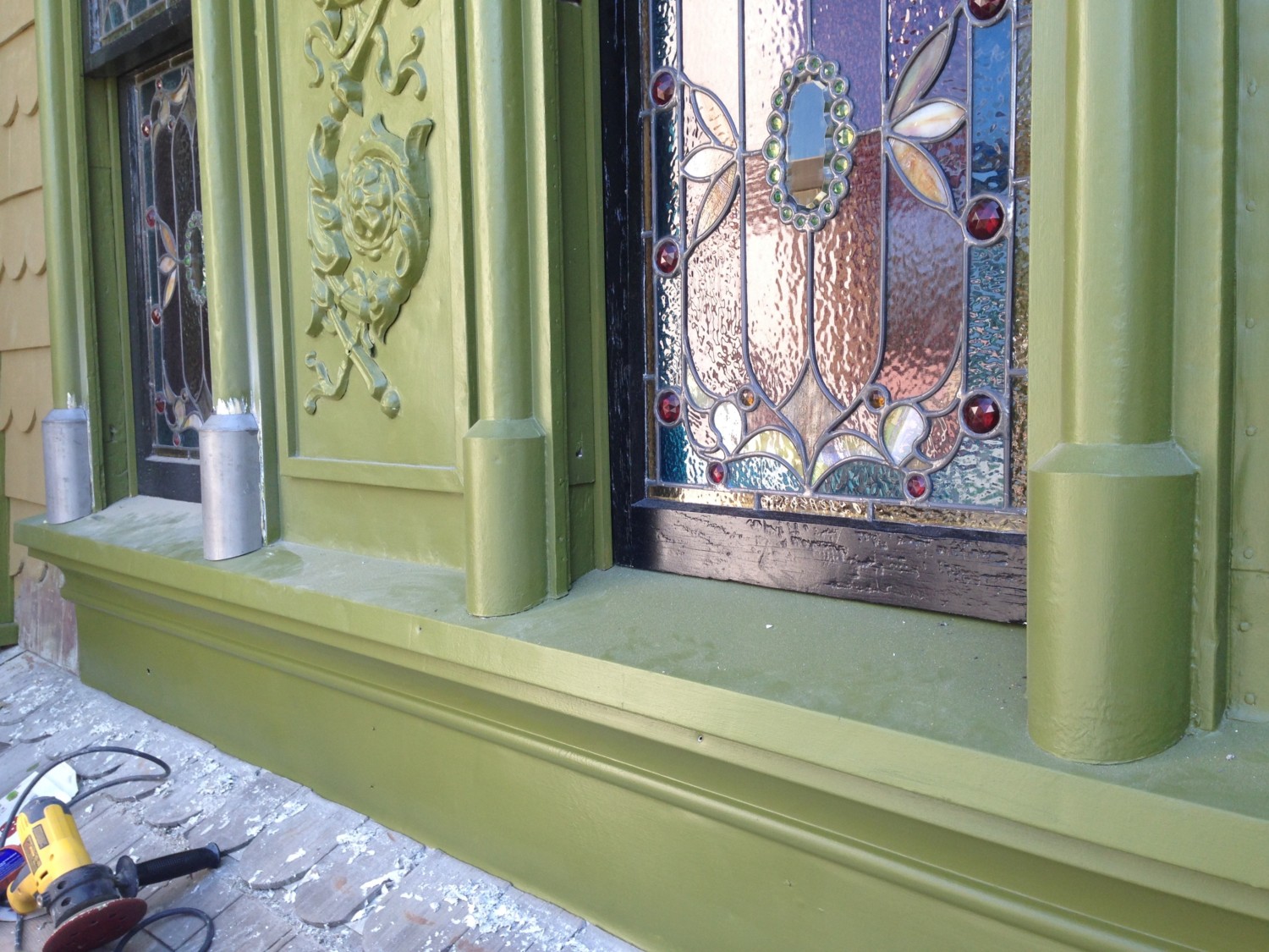 Today I nonetheless managed to get some work done. It hugely helps that I am on the shady north side. And right next to me is a beefy industrial fan. On high. And bottles of water. Well, see my lovely new column bases? Over to the left? I am SO excited!!!!!!!! There were originally six, but two were lost. As I previously mentioned, WF Norman made these up for me. The originals were soldered into place but Norman said I could just use Liquid Nails to attach. Presto! Tomorrow I will get them painted! And I am crossing my fingers that the new medallions arrive tomorrow as well! The new medallions! THE NEW MEDALLIONS!!!!!!!!
