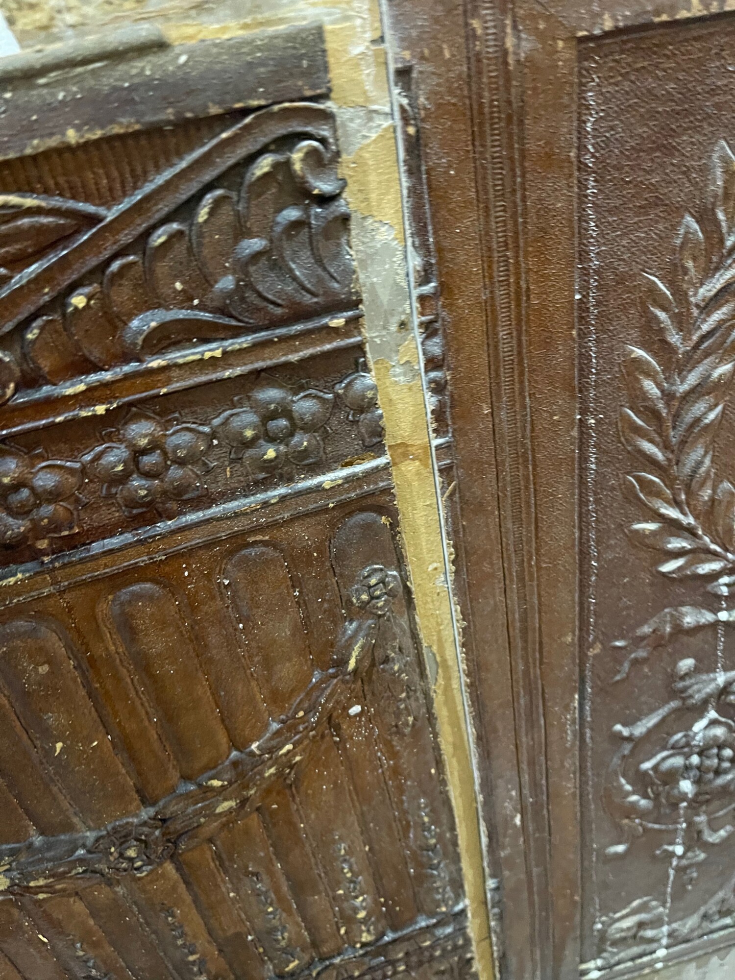 The Lincrustra panels are topped with horizontal LIncrusta pieces, and I have these as well. Above that is reeded oak trim and this, too, is extant.