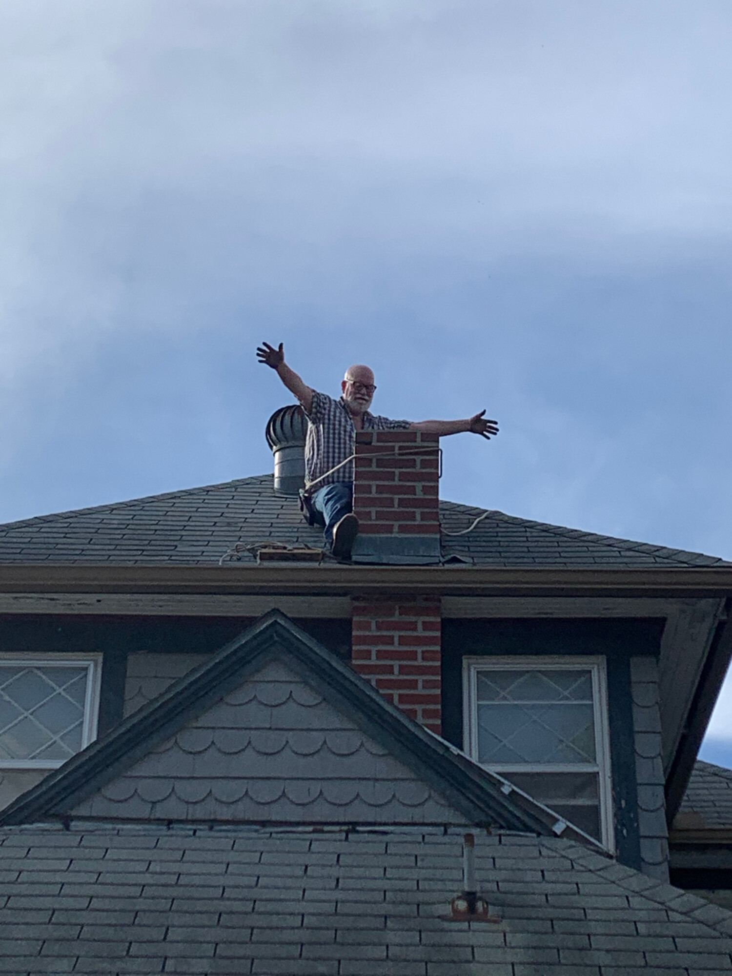 My terrified mind very grudgingly responded that this might maybe possibly could work, perhaps. And, soon, this ‘ladder’ was in place. It worked. I was now effortlessly and safely atop the ridge of the kitchen roof, directly adjacent to the chimney. My scared mind roared back to life.