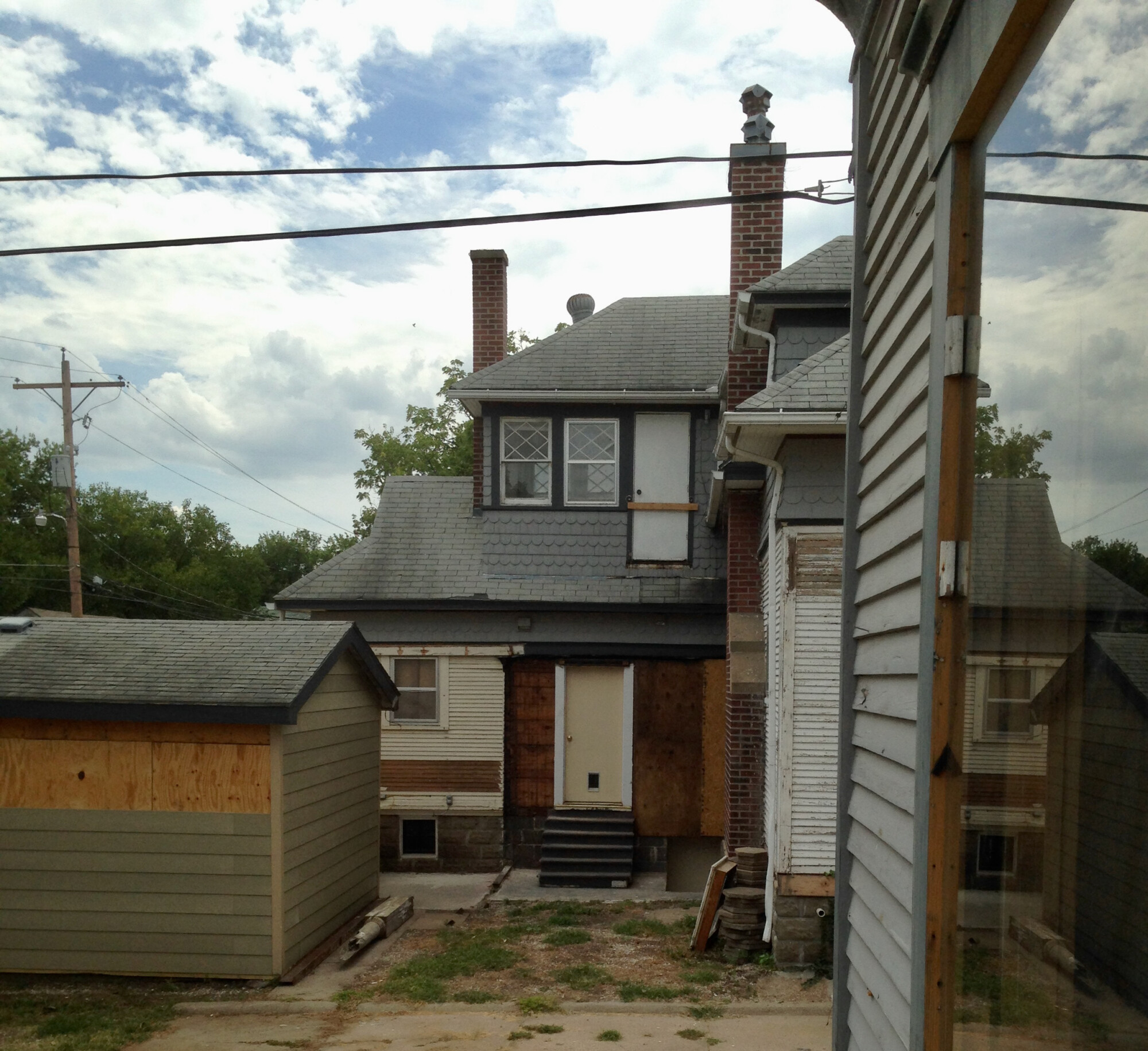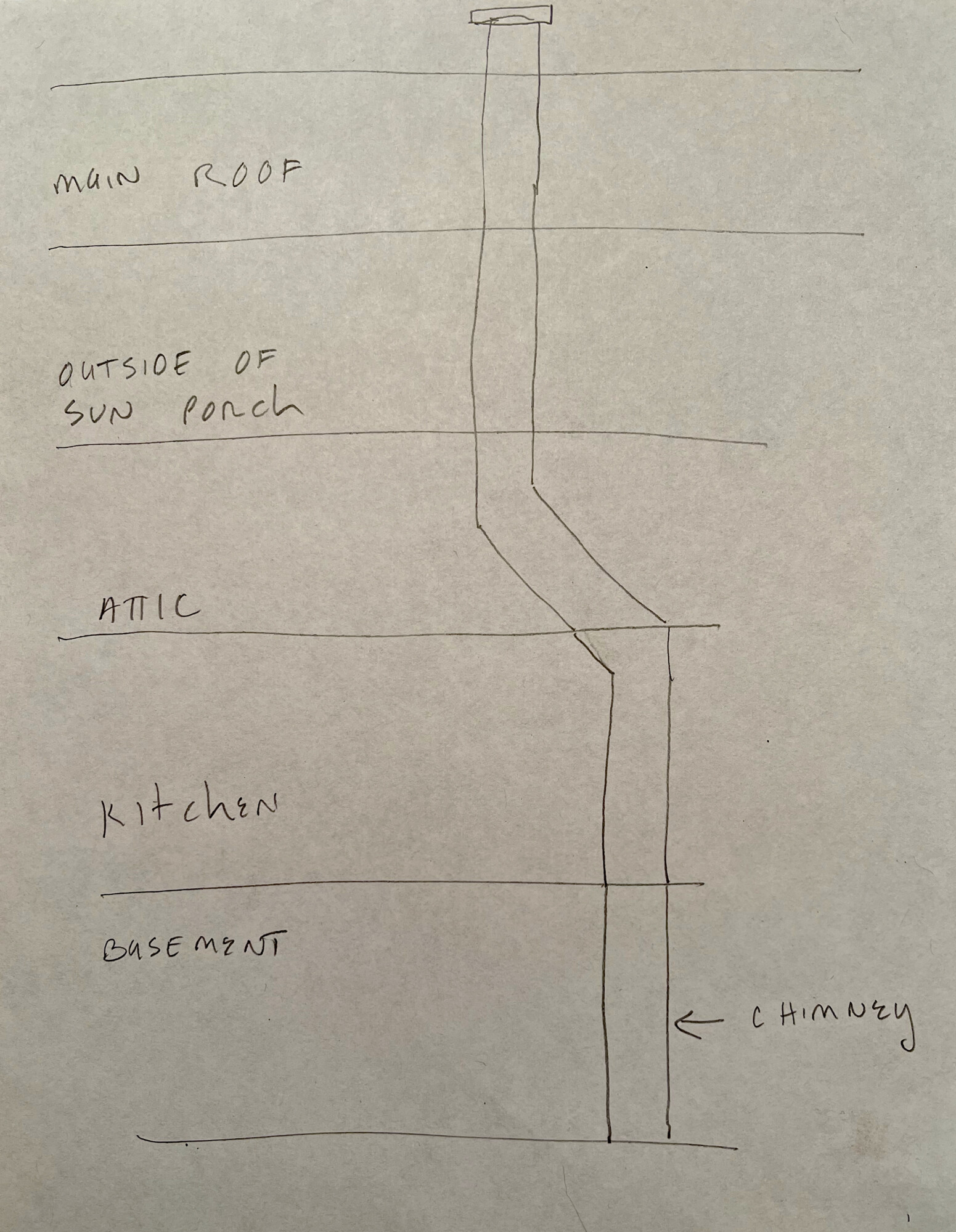 In this 2014 image, the soon-to-be decapitated chimney is to the left. The chimney to the right stays. The left chimney looks innocent enough, as its Z-shape is entirely hidden. It is about 5-feet above the upper eave. Below the eave, it hugs the exterior of the sunporch. Then it vanishes into the kitchen attic where it does its wily contortion act.