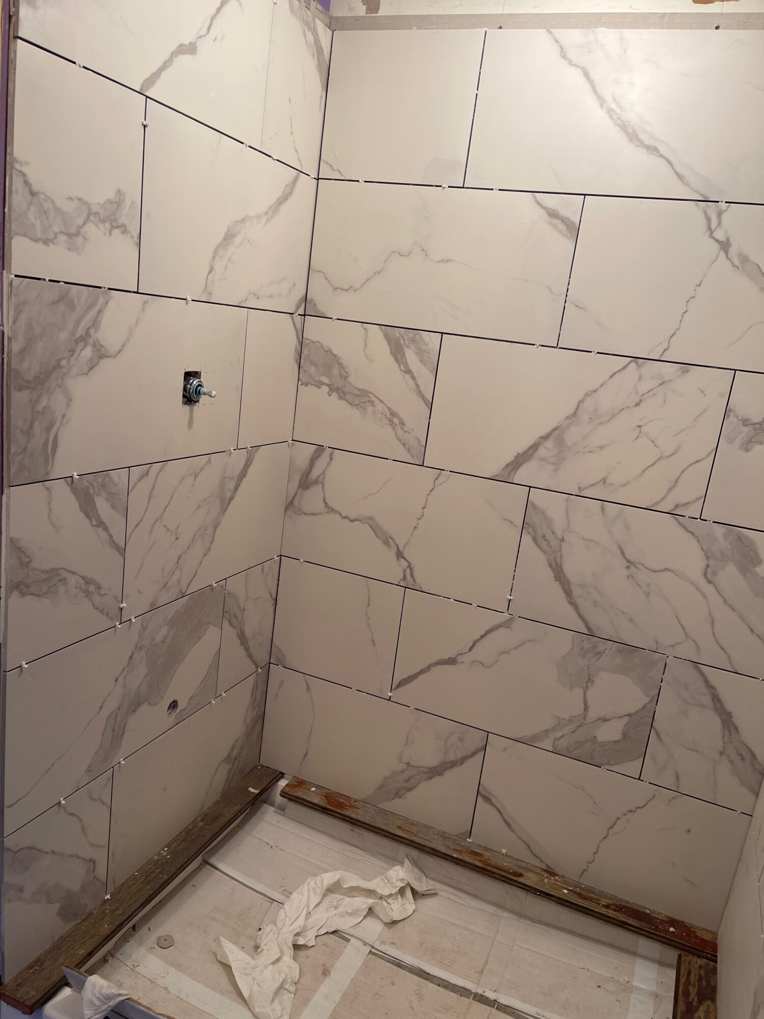 The shower in the first floor bath got tiled! I used the same tile as in my shower in the Cross House as I like the idea of the two houses being obvious ‘twins’.