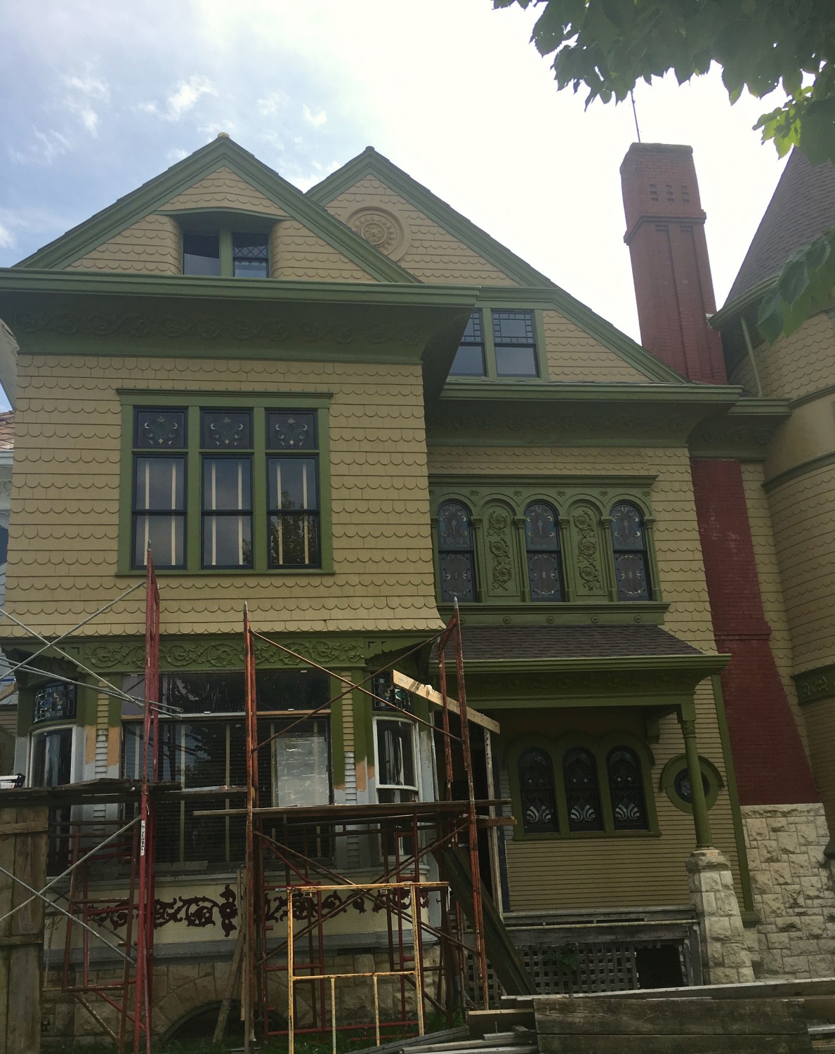 Great progress, Ross! Are the 6 vertical lines in the left side triple window louvre shades? If they are metal and were dark colored they would be almost invisible. Not that you need any more on your ‘TO DO-THINK ABOUT” lists! Pretty soon the scaffolds come down! I am trying to imagine what you will do with the uppermost peak medallion. It must have taken Bob a long meticulous time to paint the red detail, although I must say it looks more elegant all one color. Beautiful!