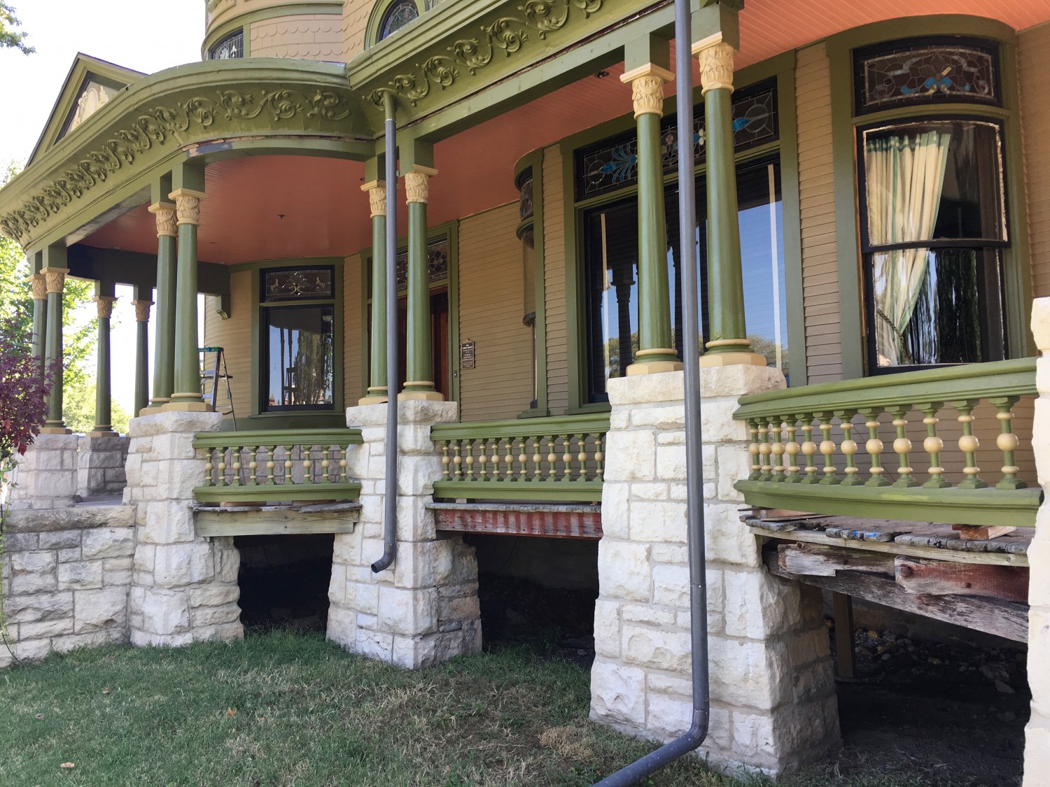 All the west columns are now glossy, and with their bases and capitals painted in color #5. The railings have been detailed, too! I sure wish Ross would hurry up and install some damn lattice! The downspouts are still factory gray because I don’t know what color to paint them. Green? Or maybe the wall color? Black? Sigh.