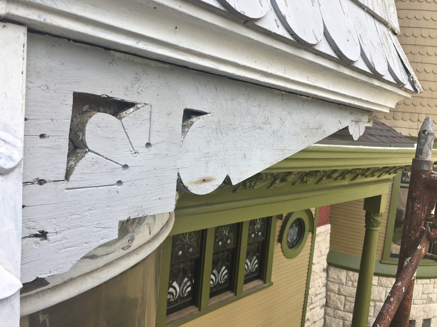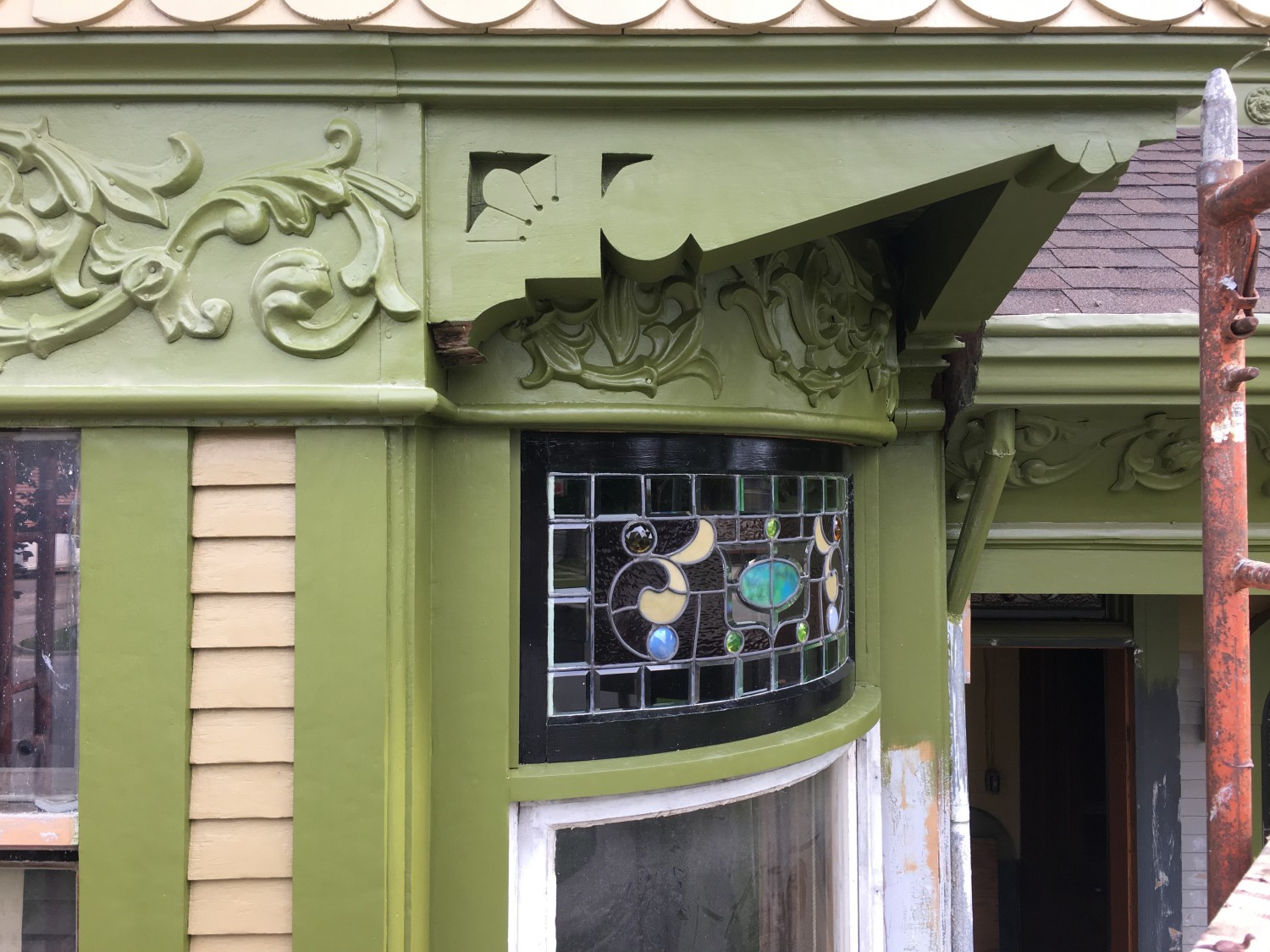 I especially like how that last photo so clearly illustrates that you don’t need sharply-contrasting colors on ornate exterior detailing. On your house especially, the profile and relief of the tin and wood emphasize it sufficiently.