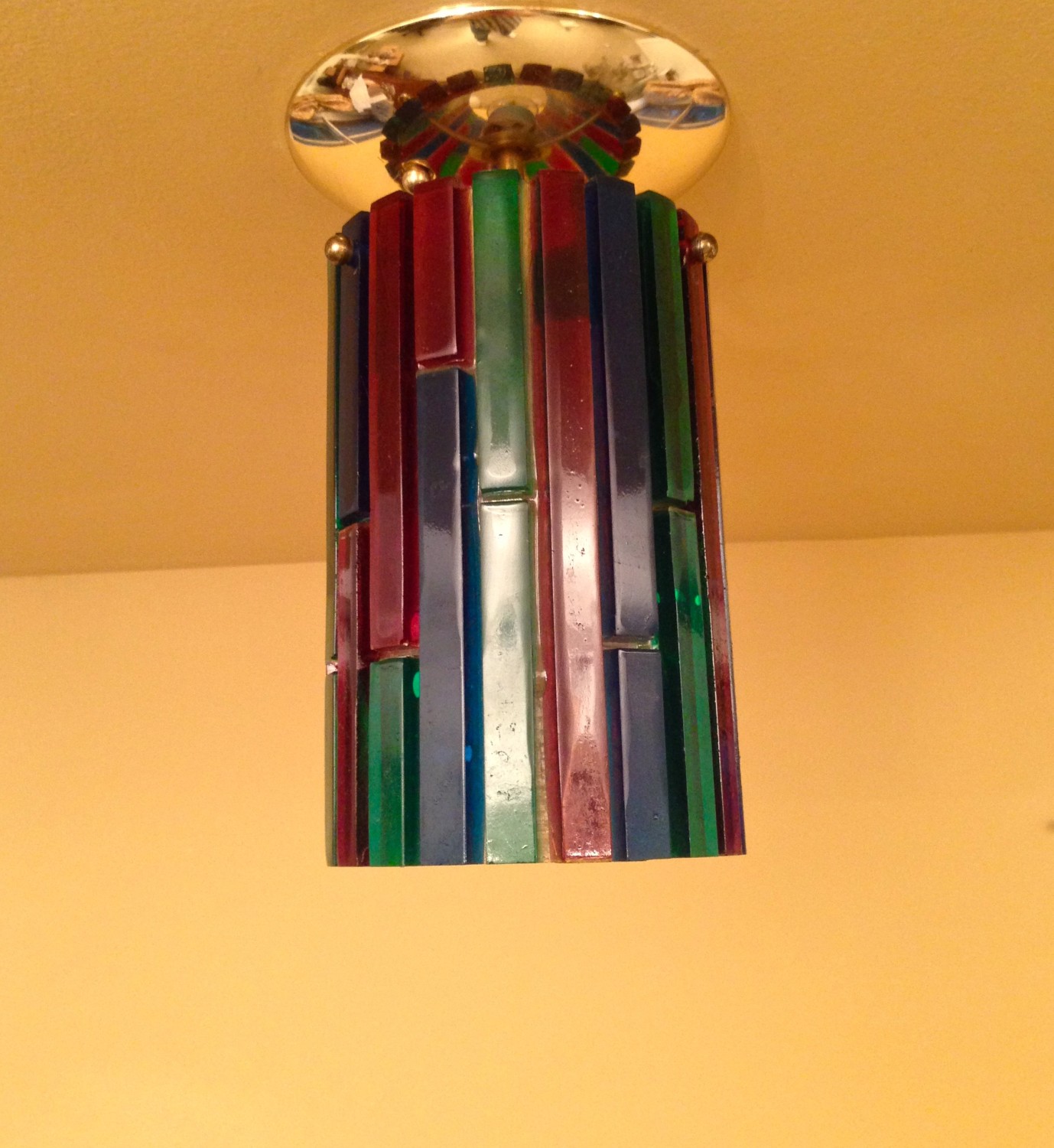 The shades comprise thick strips of red, green, and blue plastic. The effect when lighted is amazing. Wow. And oh-so-60s! So very mod!