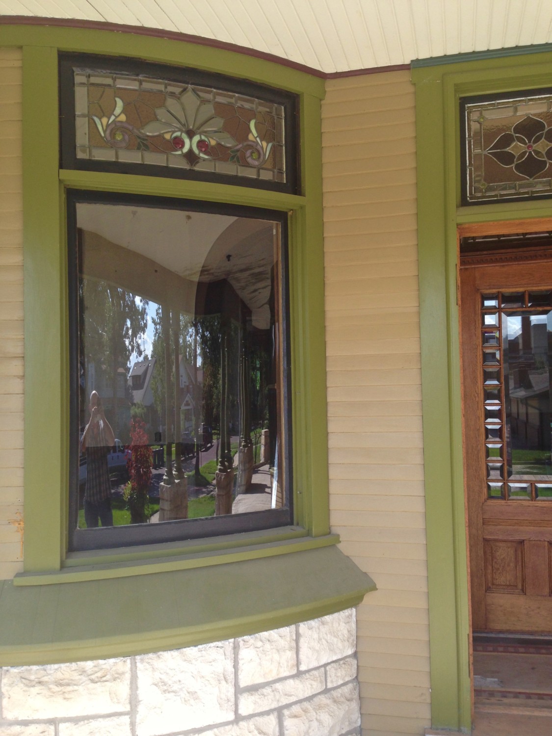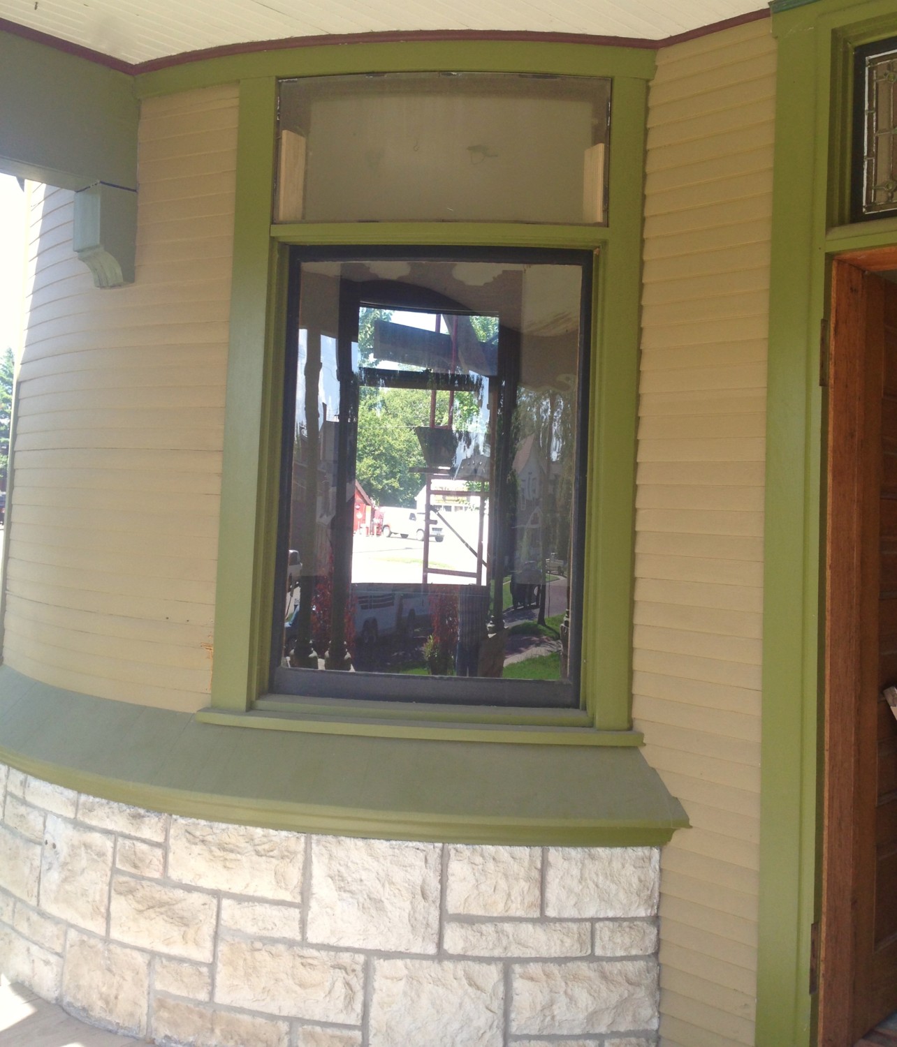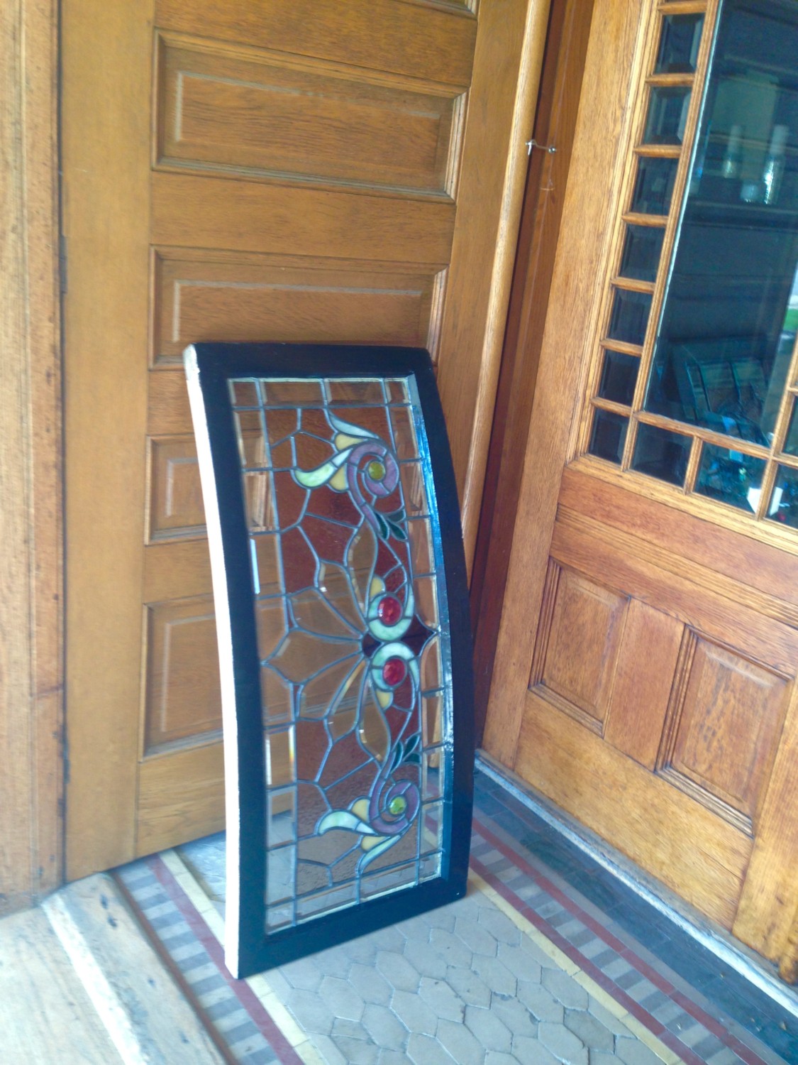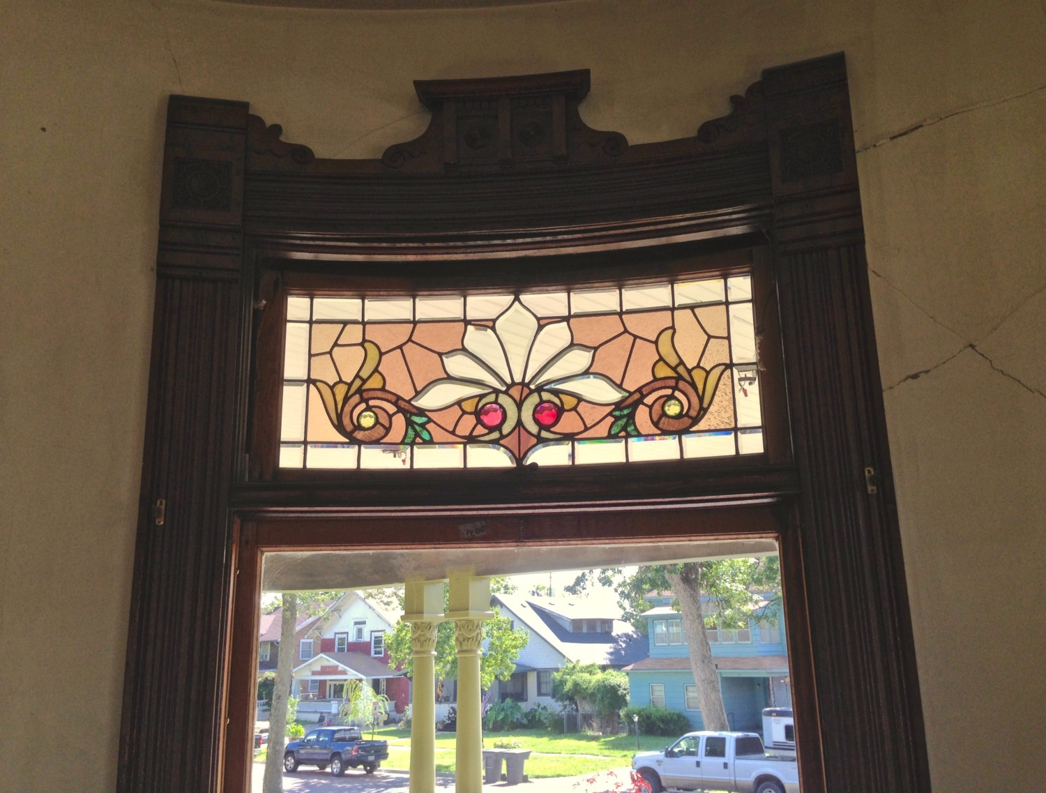 …be painted. Whoee! Here is one transom patiently standing in the vestibule, waiting to be reinstalled. Such excellent manners!