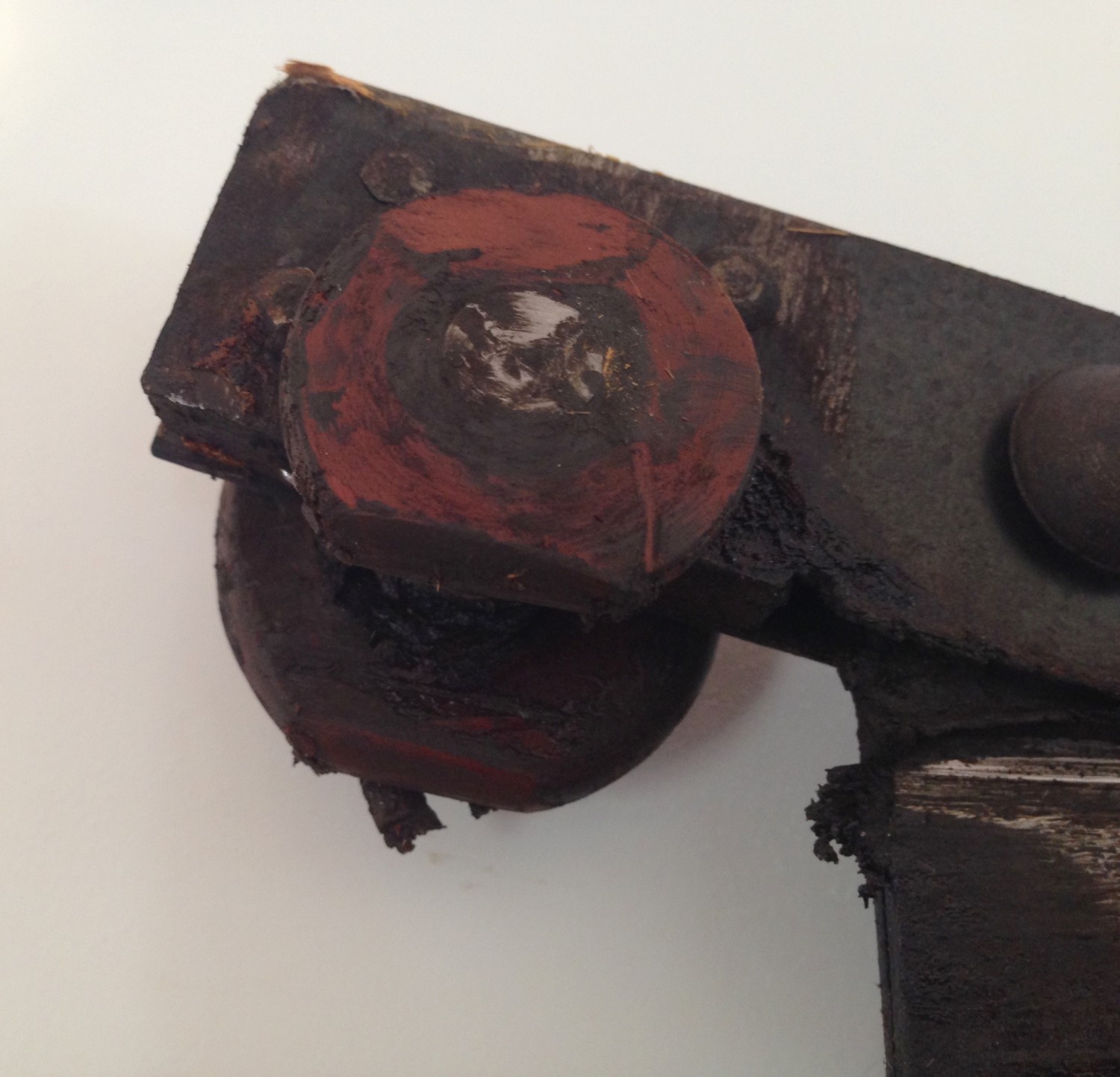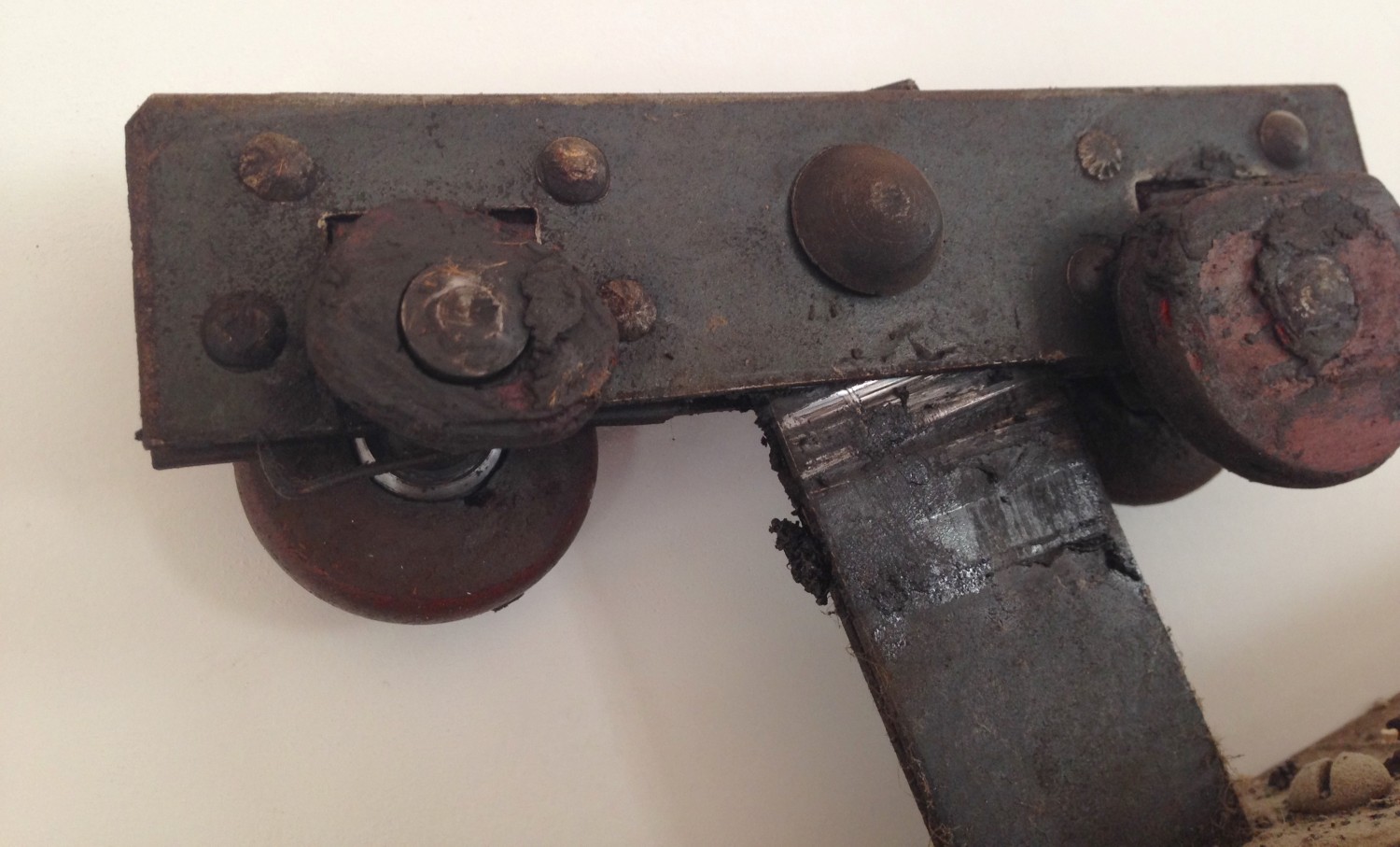 The newly revealed Coburn Mechanisms. I had thought there were two pair of wheels on each door, but there are eight wheels per door! The wheels are fibre, and, as the image shows, they are in APPALLING condition! Appalling! I am shocked! The two wheels to the left have not turned in who-knows-how-long, but were simply dragged along in the tracks. No wonder the doors were so hard to open close!