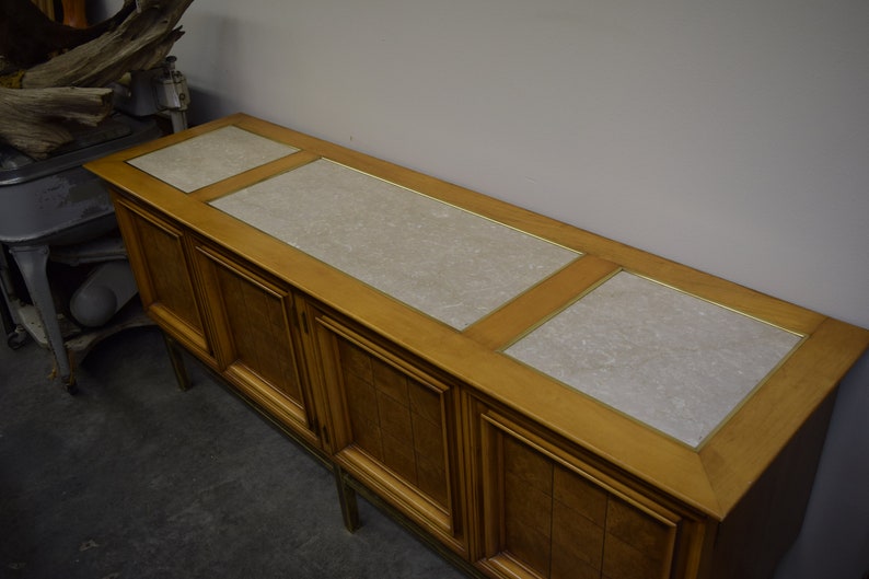 That side board is fabulous. Aside from the travertine and the beveled glass, the wood. And the table too. I love how the grains are combined and mixed. This is a hangover from previous decades. My coffee table and end tables have a veneer pattern to them. In the subsequent decades it looks like that concept was simplified and then simply went away. The burl wood on the sideboard is what really catches my eye.