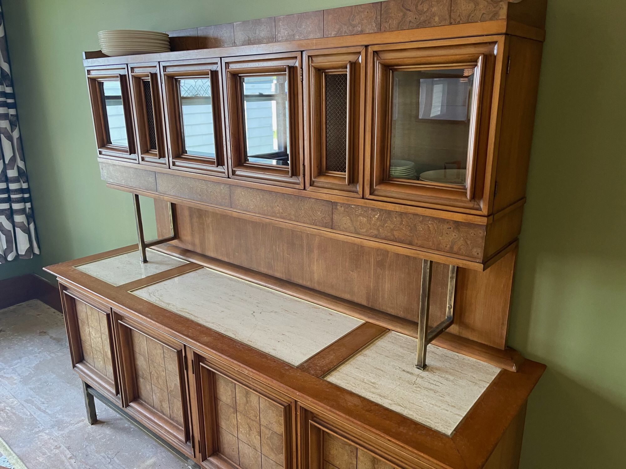 The sideboard is fabulous, and with travertine inserts and beveled glass. It needs a good polish after being in storage since 2013.