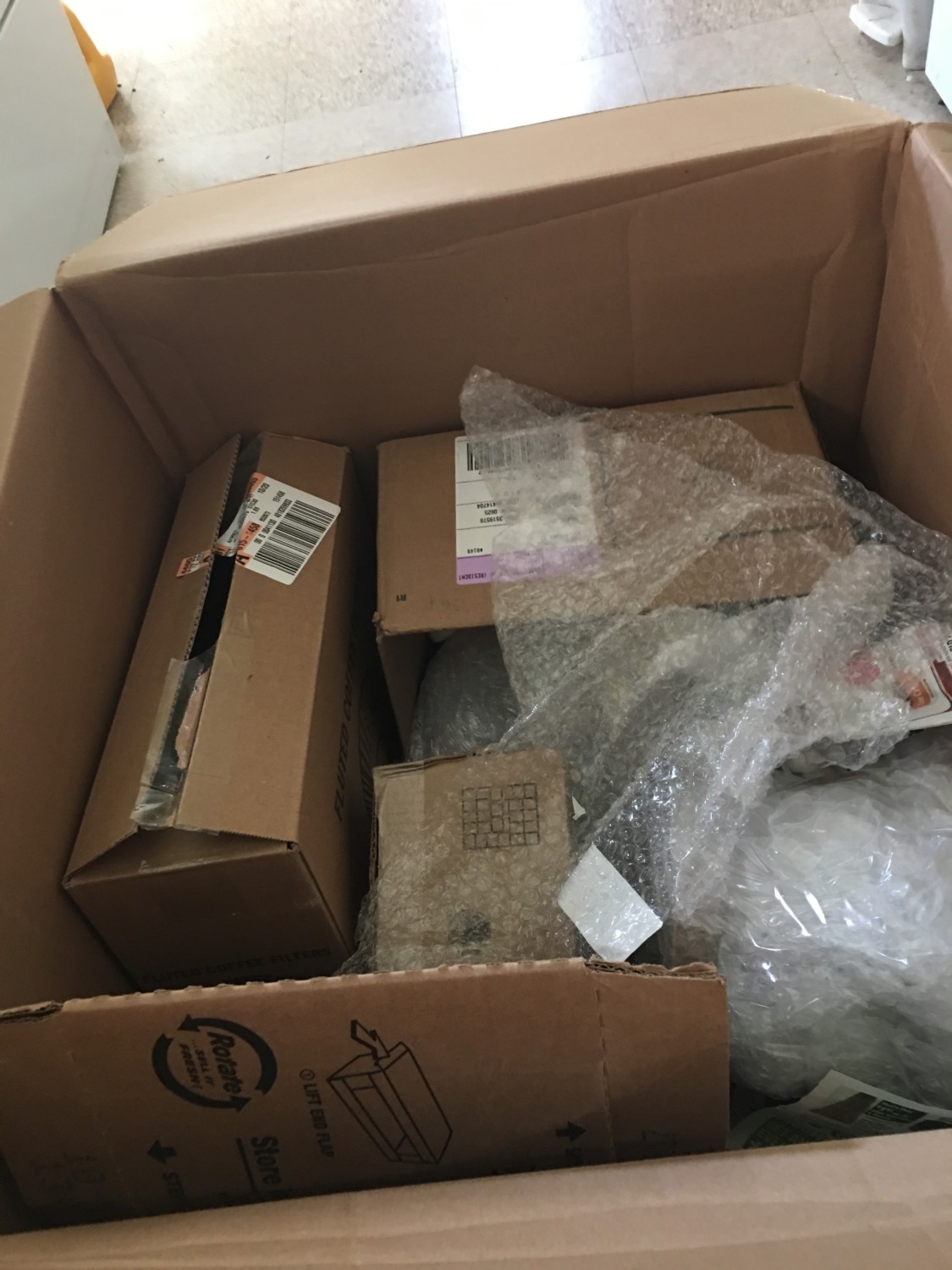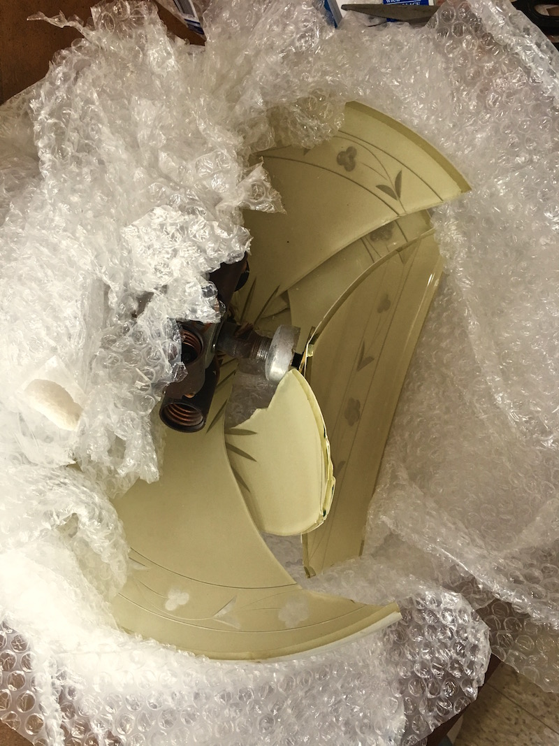 A week later my nice UPS guy delivered a box and, as he handed it to me, I drew back. “Oh oh. I just know this box isn’t packed well.” The box had this kinda crumpled look common to boxes without enough packing material inside to withstand normal handling during shipping. The nice UPS guy nodded assent, and gently shook the huge box. “Sounds OK.” It did. So, maybe I was wrong? My heart lifted. But things quickly grew alarming when I opened the box. My heart sank. The box was, as expected, only but half filled. Now, I cannot tell you how bad this is. Because whatever was inside bounced around the box interior the whole trip. Bounce! Bounce! Bang! Bounce! Bang! Smash! Well, I pulled out the little bit of packing material, gently lifted the bubble-wrapped whatever, placed it on a counter, and started cutting away. I could now hear broken glass. And inside was my worst fear…