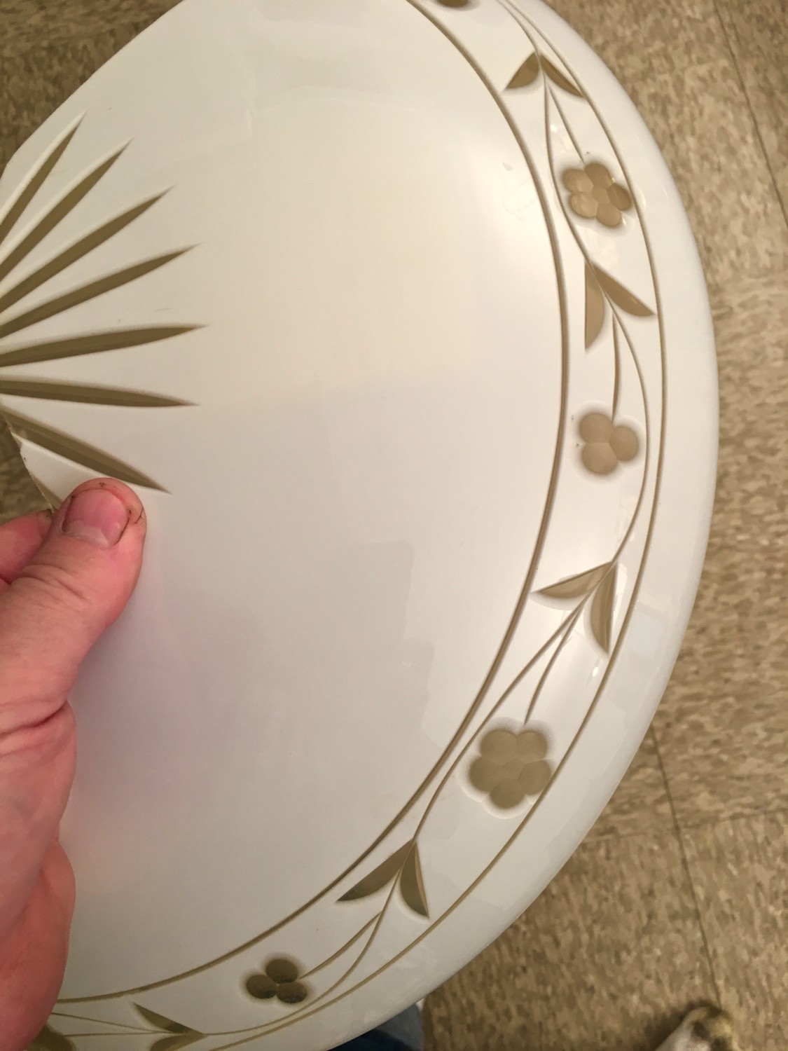 This was on eBay. My lust was instant and intense. I had had HAD to have it. The opening bid was high, but profound desire had already eclipsed my senses. I recognized the chandelier as being by Lightolier, and I love love love Lightolier. The chandelier was also 1940s, and I particularly adore 1940s Lightolier. I had never seen this chandelier before. This increased my desire. Immensely. Note how the shade matches the glass sphere. OMG! I had to have this!!!!!!!! My heart was soaring!