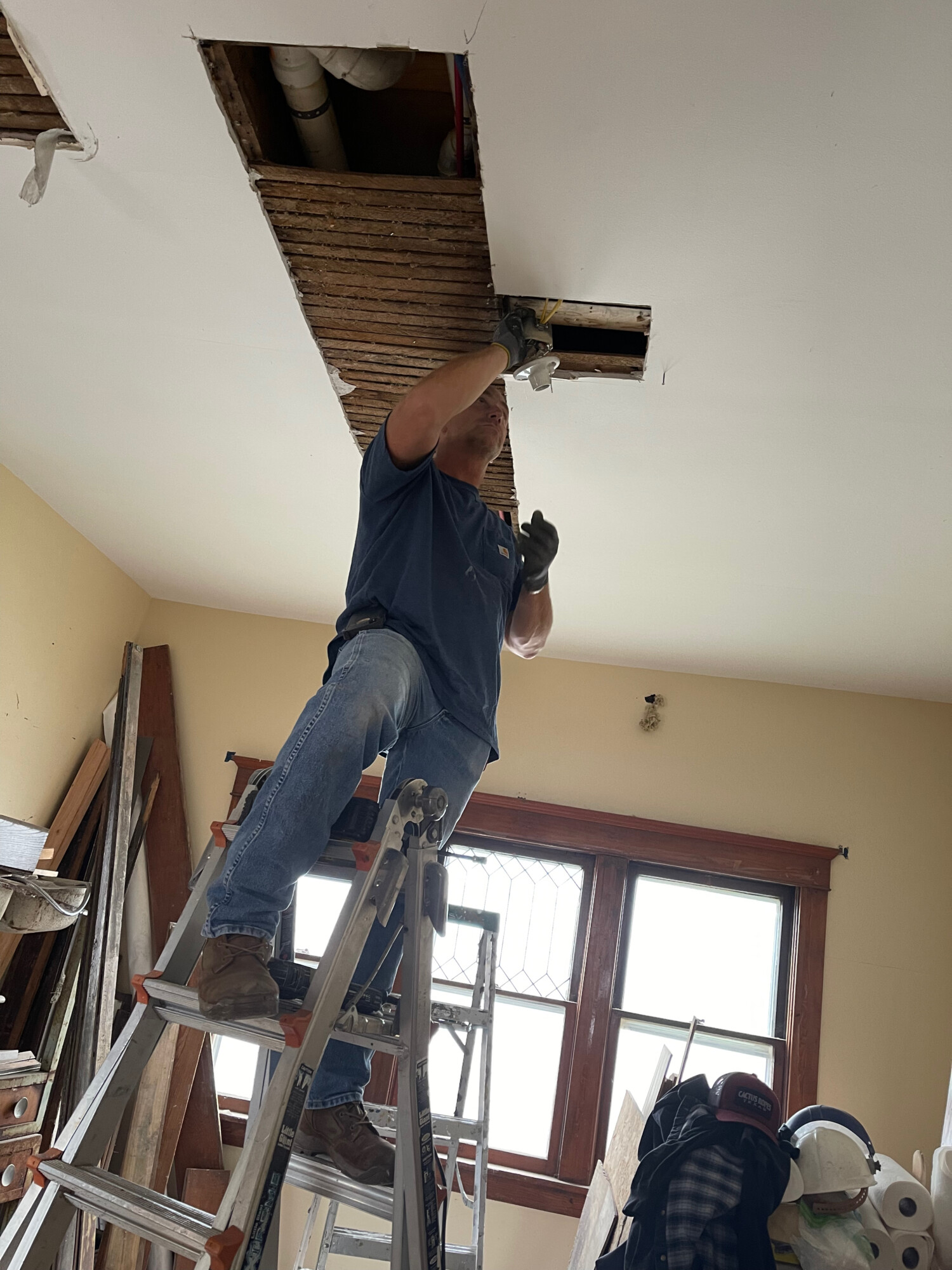 This long hole in the dining room ceiling is new, so we could install plumbing. Adjacent is a ceiling electric box centered on the ceiling. Or…ominous drum roll, please…I thought it was centered. But as I stood at the far end of the room and looked directly at the middle of the leaded-glass window, I discovered the unthinkable. THE BOX WAS 6-INCHES OFF CENTER! My heart stopped. My whole body convulsed from the shock, horror, and revulsion. And…oh no!…what would Cody think when he hung some dazzling vintage chandelier in the room only to discover…oh, I just cannot even finish the thought. It is too terrifying. So, while I cowered in the corner, shaking uncontrollably, Scott came to the rescue and moved the electric box into perfect alignment with the center of the leaded-glass window. Then the sun came out, birds sang, and the stock market soared. Really!