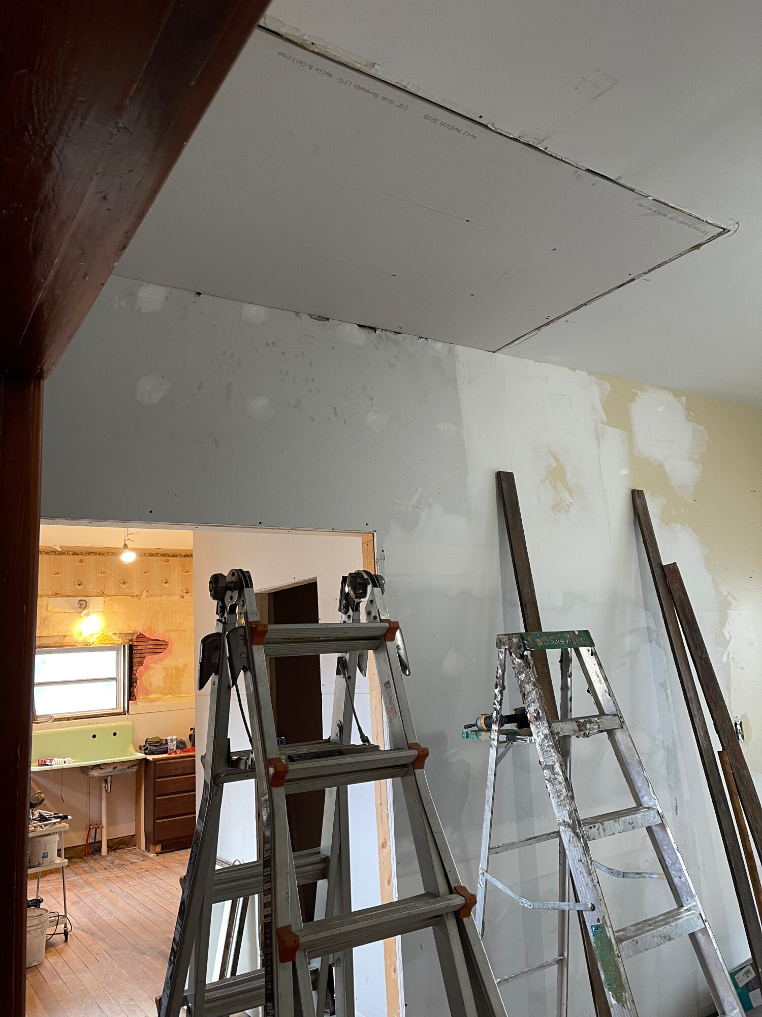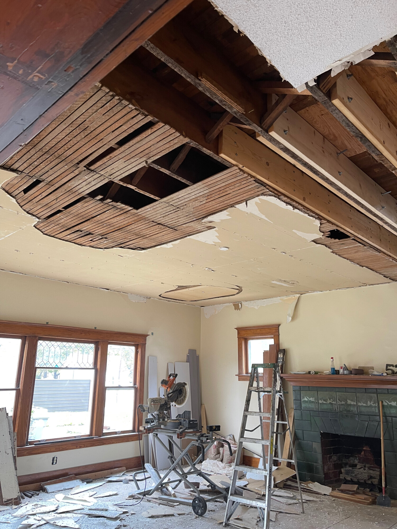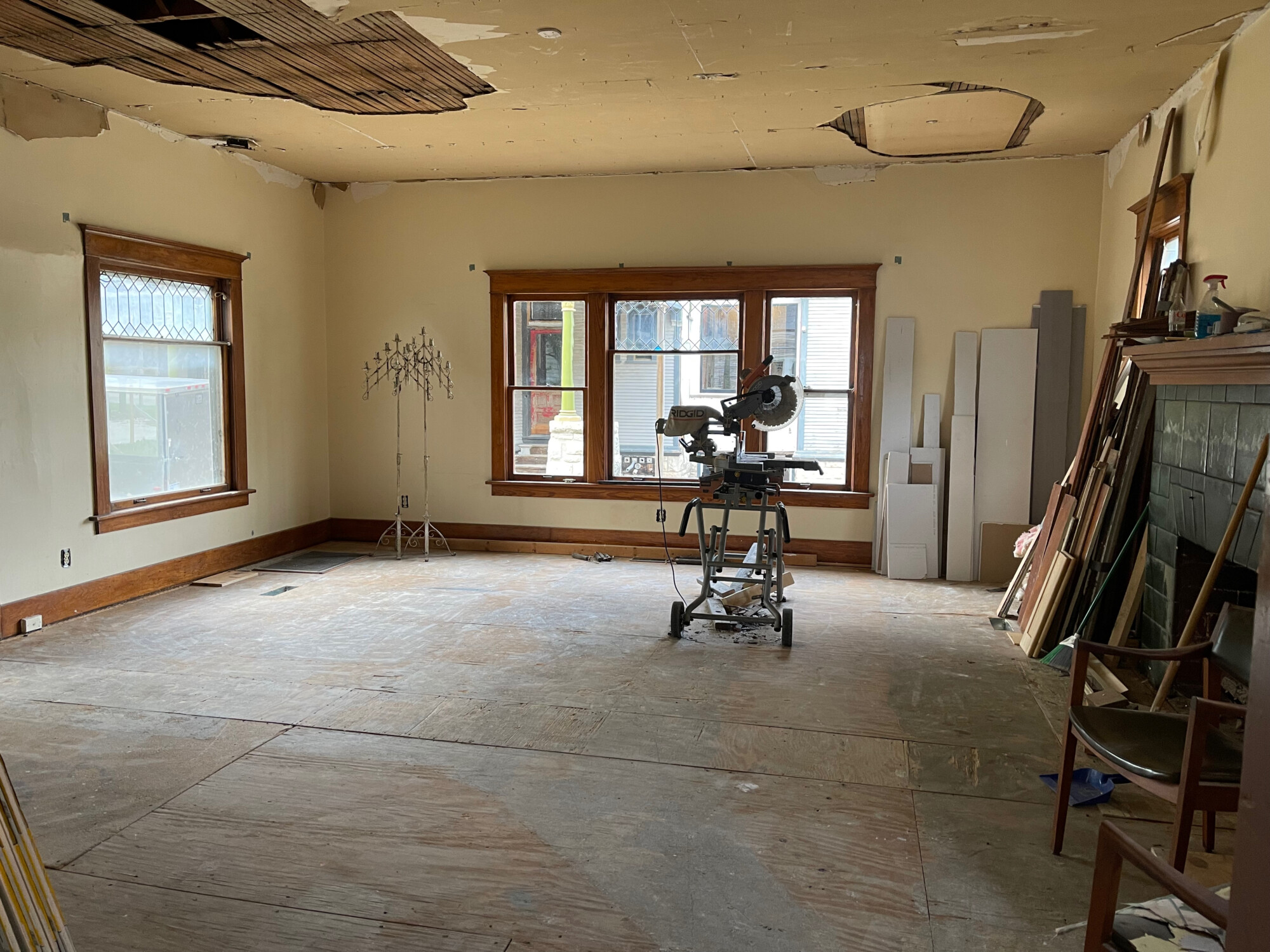 The ceiling you now see is plaster from the circa-1921 conversion. And, also for the first time in seven years, the spacious living room is no longer a storage room. Again, 1, 2, 3: SQUEE!!!!!!!! See the curious oval loss of plaster in the upper right? I plan to infill that with plaster! If that works out, I will infill the other areas of plaster loss with plaster. There is a lot out of camera range. Sigh. (Note how big the room is!)