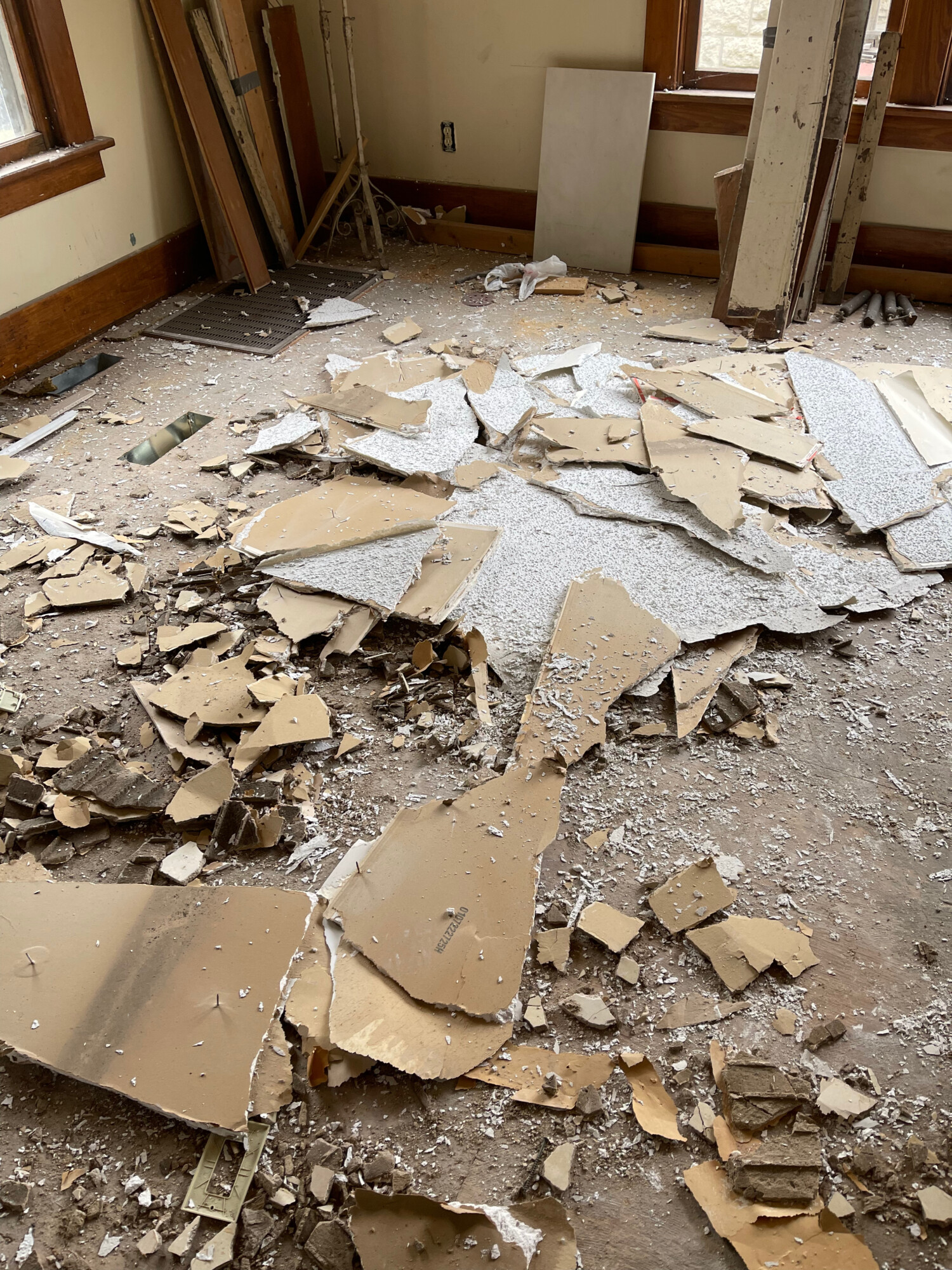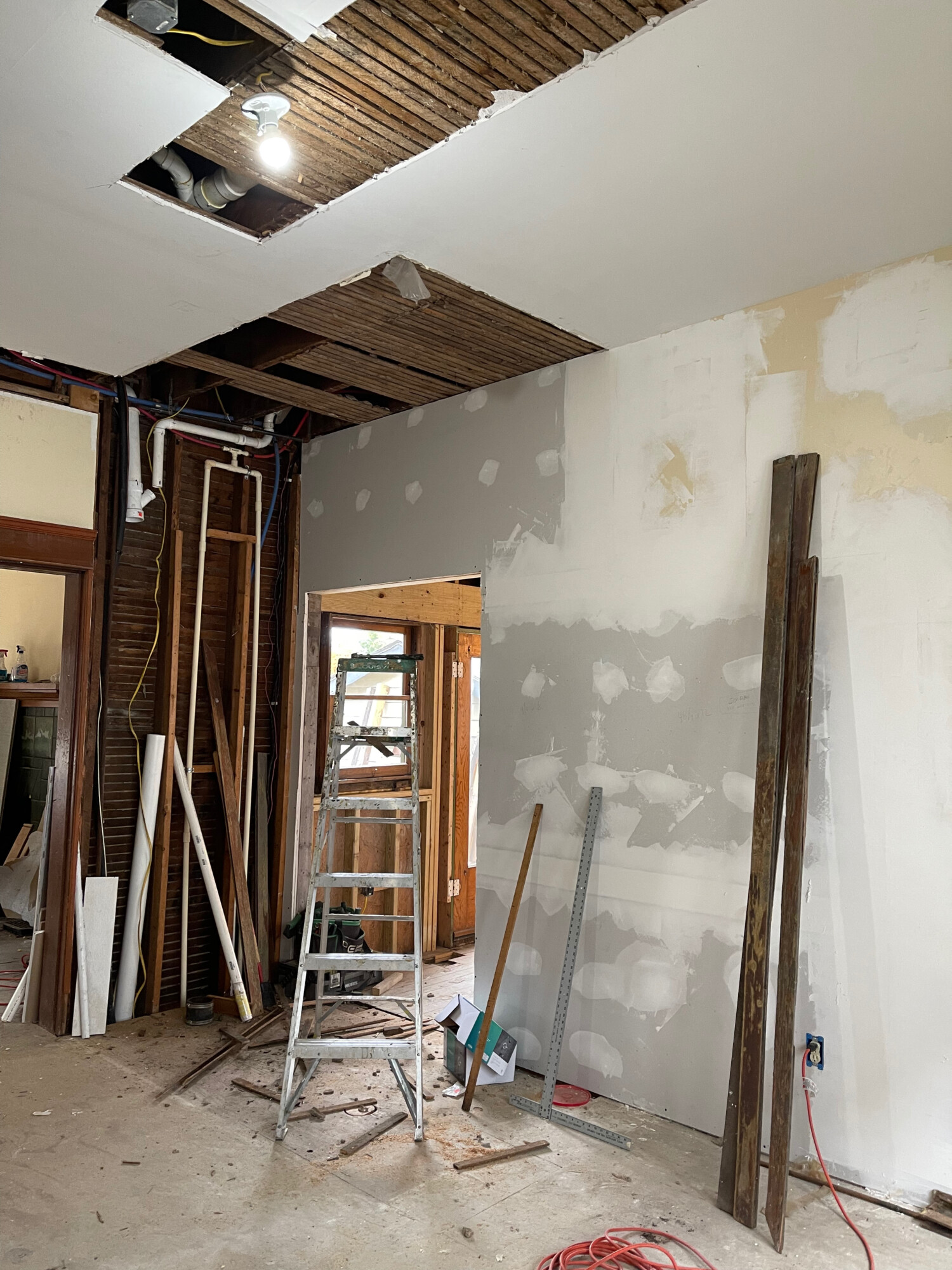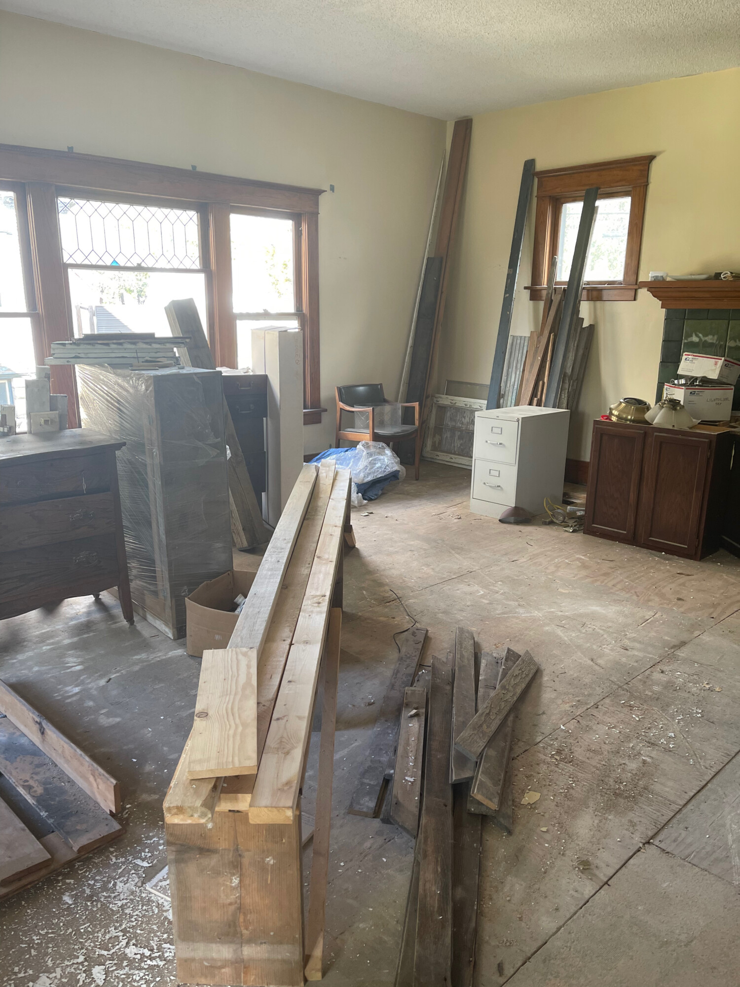 The ceiling you now see is plaster from the circa-1921 conversion. And, also for the first time in seven years, the spacious living room is no longer a storage room. Again, 1, 2, 3: SQUEE!!!!!!!! See the curious oval loss of plaster in the upper right? I plan to infill that with plaster! If that works out, I will infill the other areas of plaster loss with plaster. There is a lot out of camera range. Sigh. (Note how big the room is!)