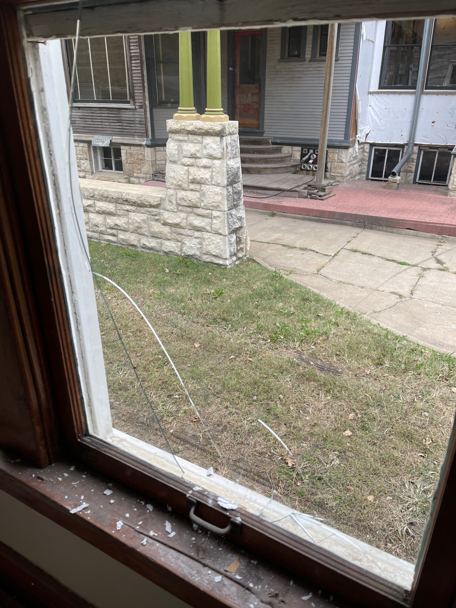 While yanking down the offending popcorn-covered drywall, a small piece went flying. I watched, as if time had slowed. It floated sideways, and floated, and floated. Then smashed into a window pane. Oopsie.