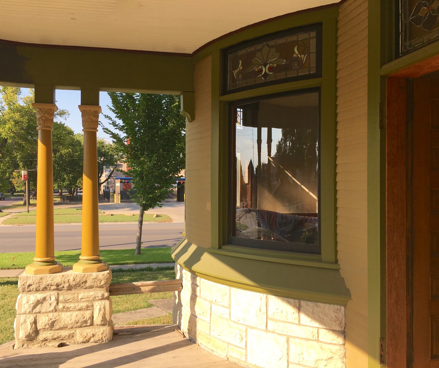 Originally, the columns were much lighter than the green trim (which is the original trim color). But I tried painting the columns the wall color in 2014 and did not like the results. The pale columns did not look, visually, able to support the heavy roof. And, when you stood before the house, the columns painted the wall color melded into the background wall color.