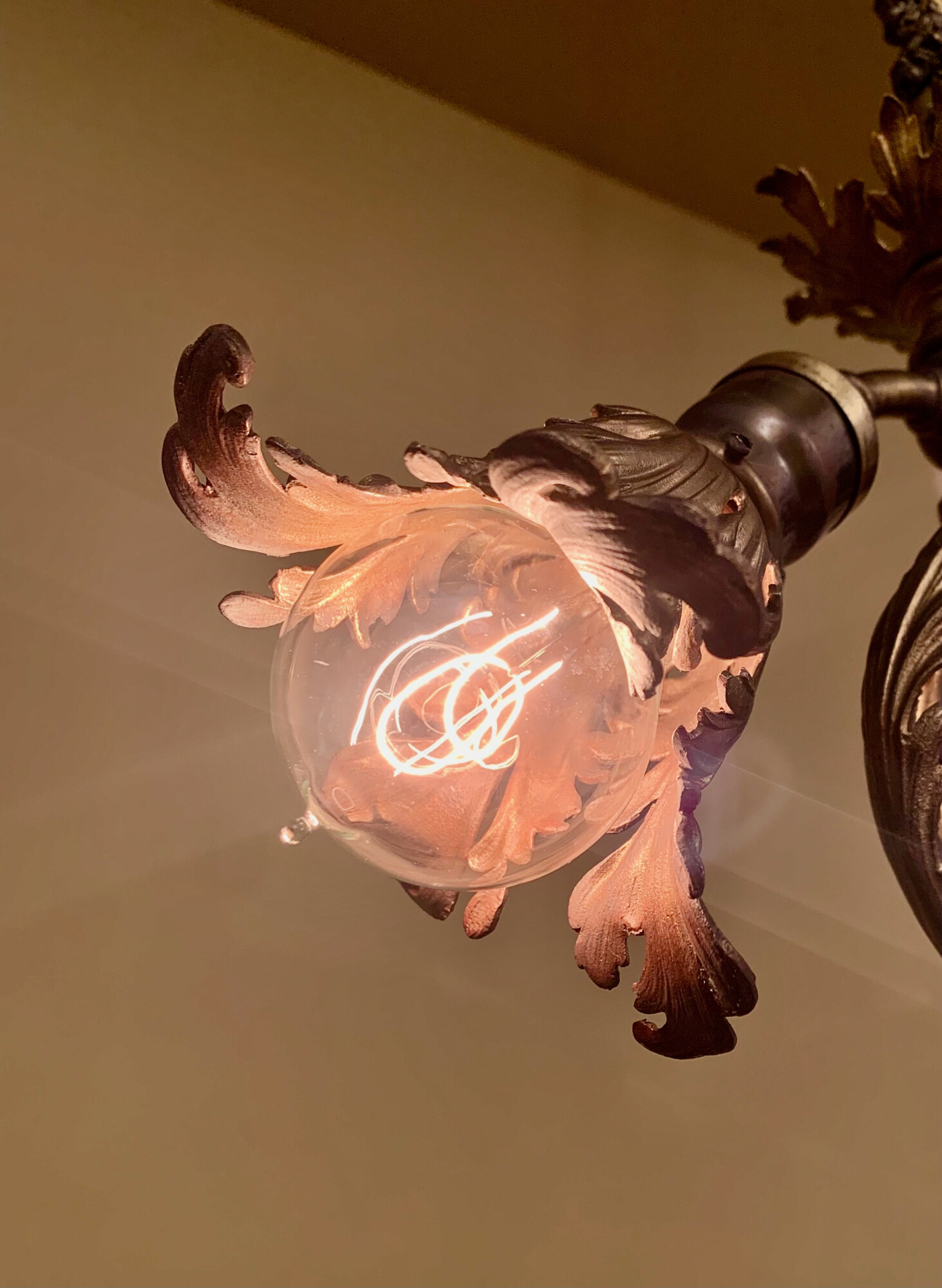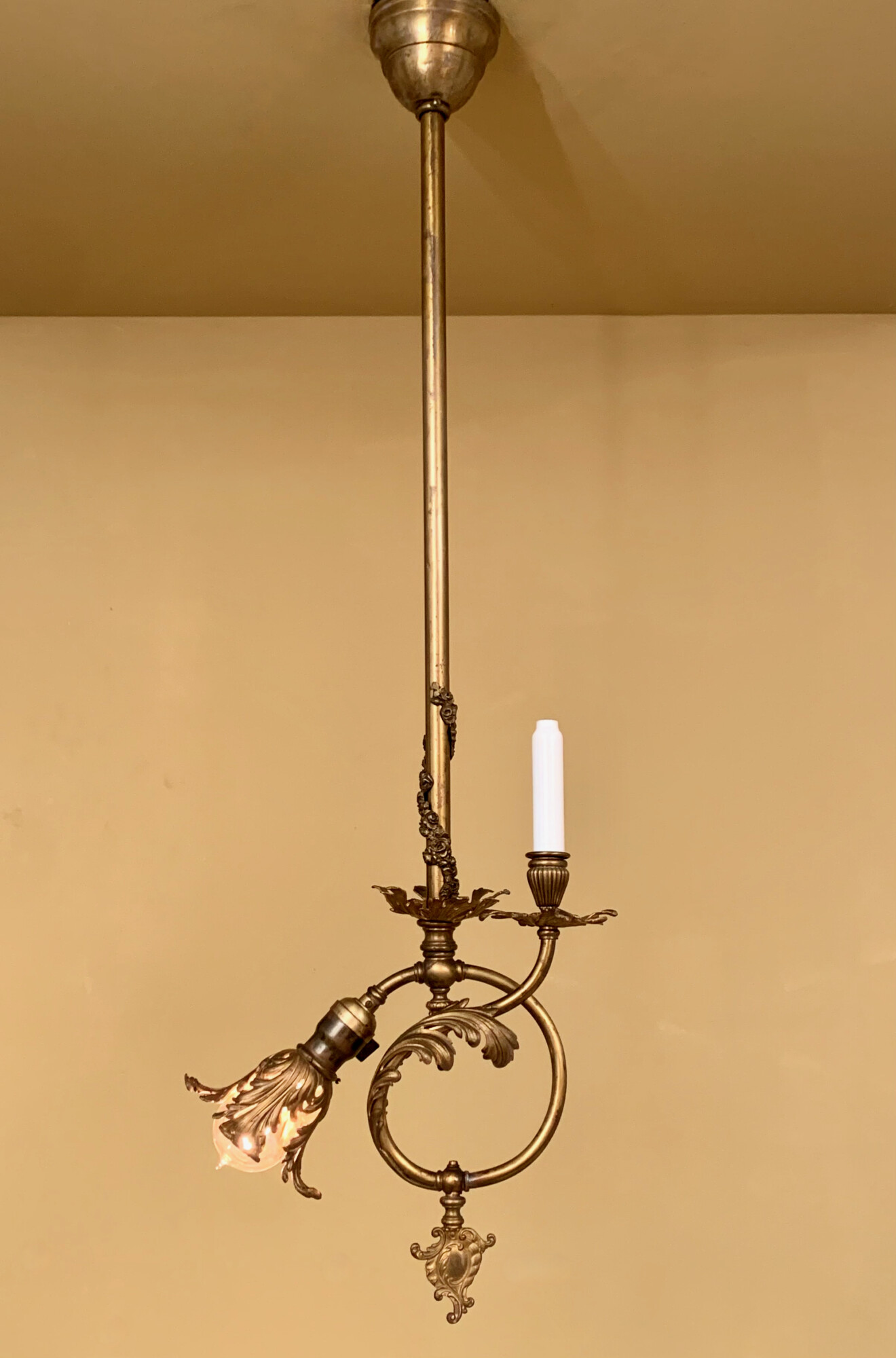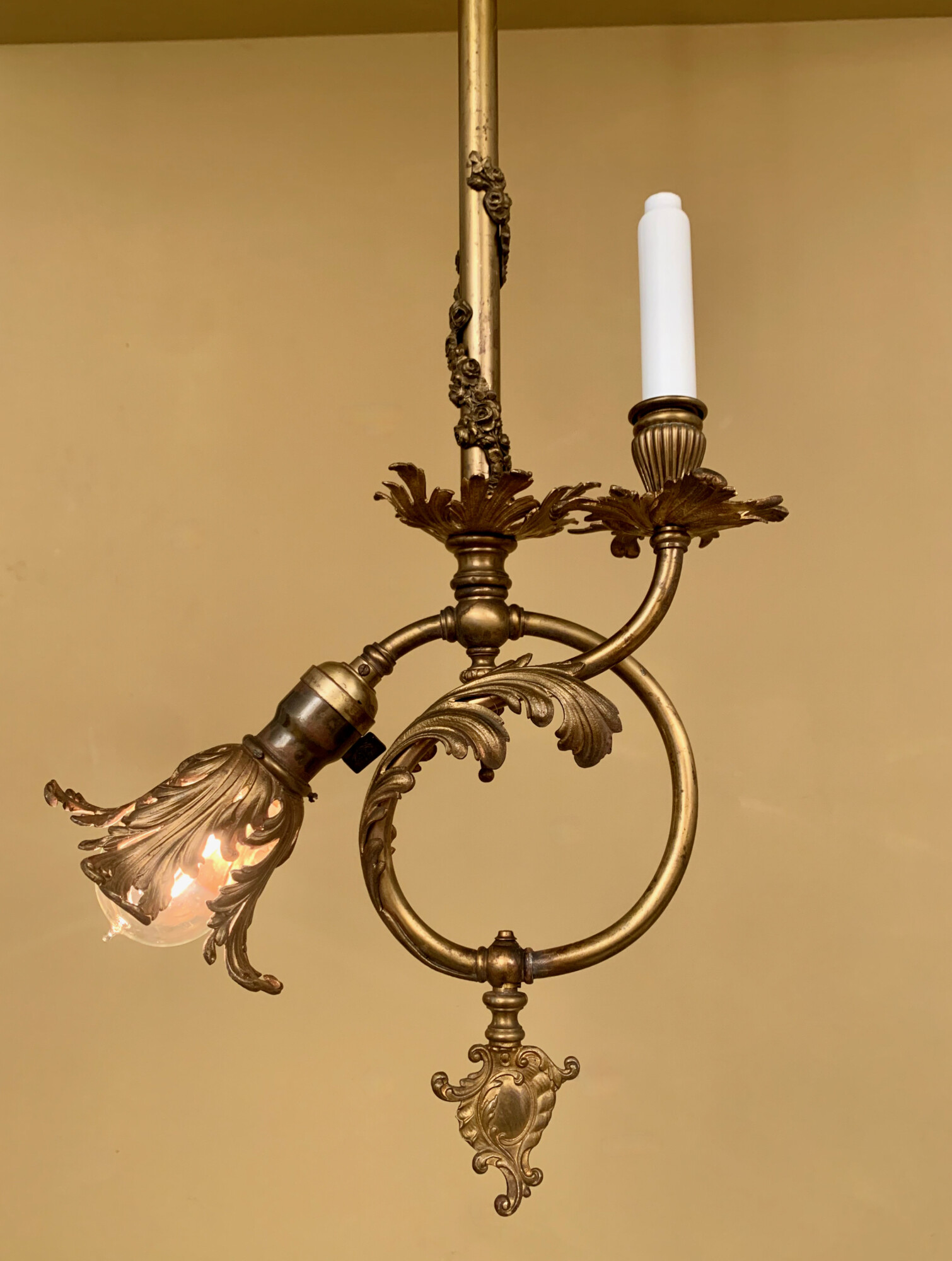 Now THAT is a sweet little gas/electric! I knew the fixture had to be fairly ornate, given the asymmetrical gas cock, but seeing it all together really surprised me. I didn’t expect the Acanthus bulb cover and it pleases me to no end that you’ve got the glass “candle” cover! Like a few other mentioned, it seems like it would be a nice fixture for the Cross House property…maybe in the carriage house?