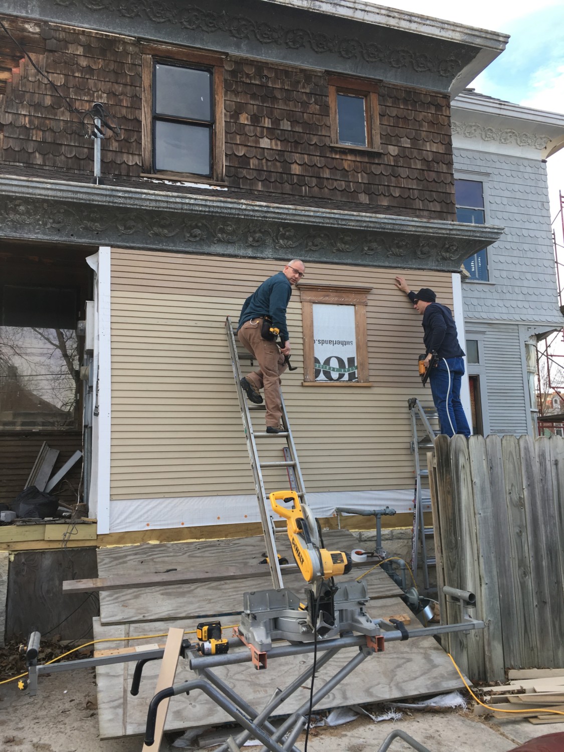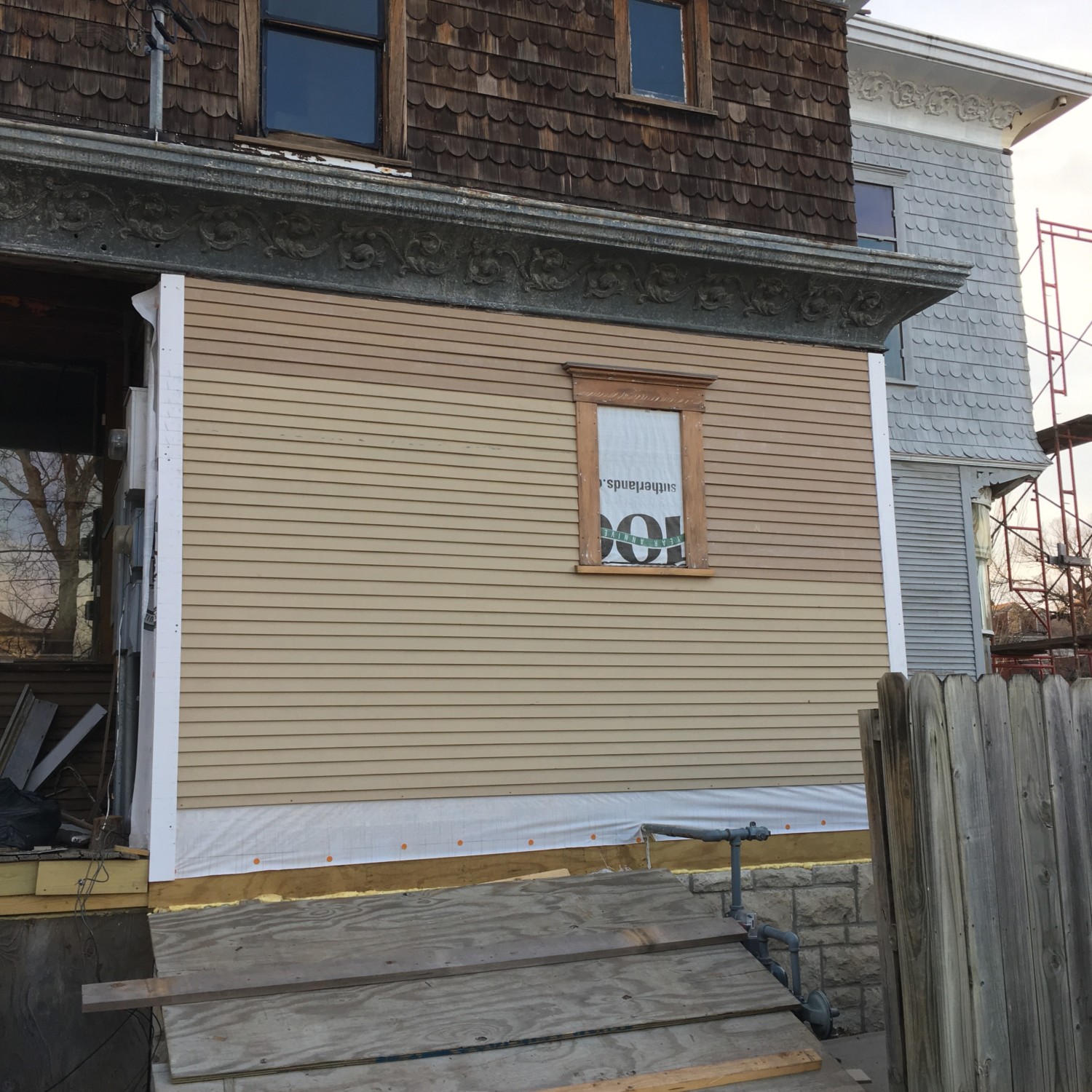 All mostly kinda sorta done! When the new custom-milled water-table trim arrives soon, we can finish the very bottom! Because the foundation is not level, and the curved cornice is not level, and nor are these elements parallel with each, AND because the window is not level, you may appreciate how much work was expended fudging every single piece of siding to make the finished product NOT look crooked and NOT like everything was installed by drunks! Oh, compare this with…