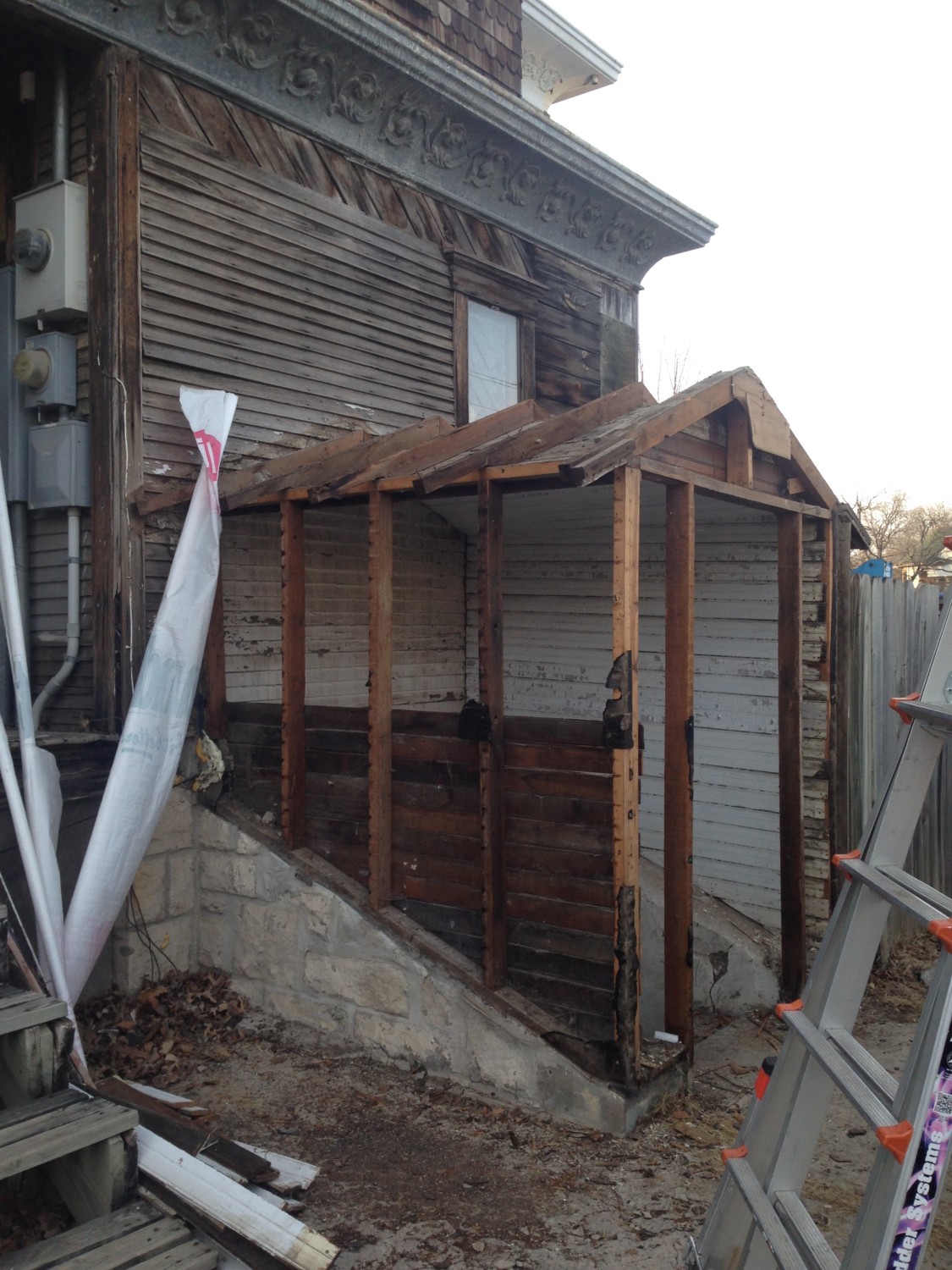 A significant affront was a non-original (and impressively poorly built) shed over the original entrance to the basement. This HAD to go! The limestone IS original.