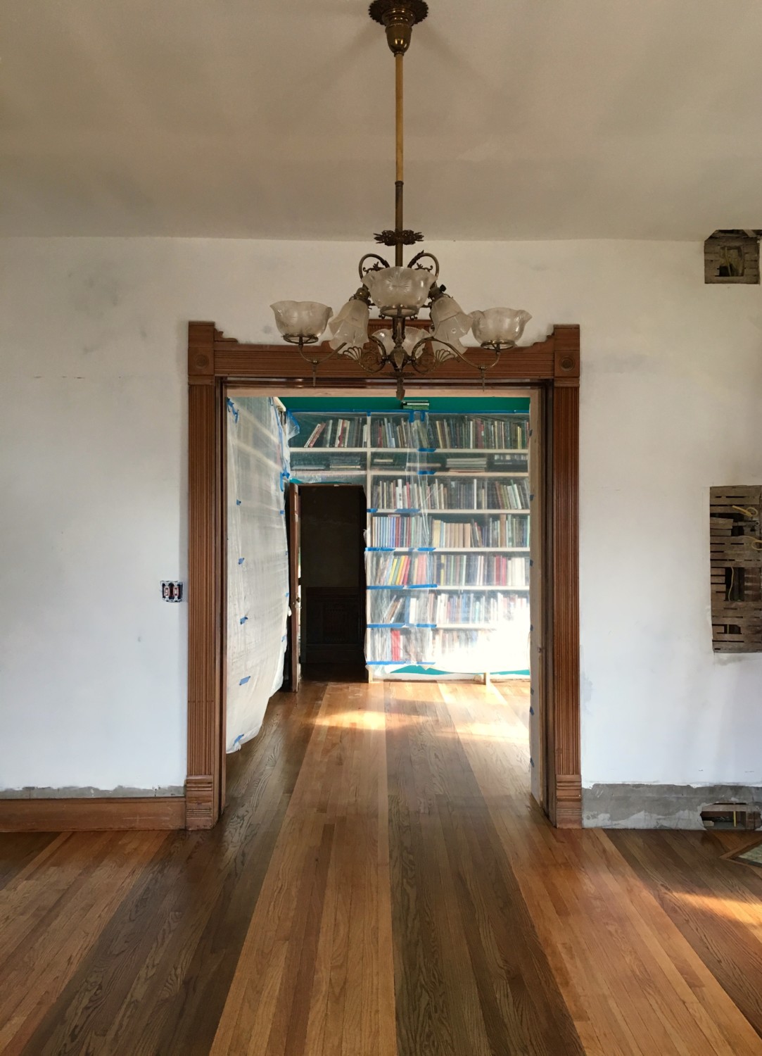 And…my boring 1950s oak floors. Handsome Justin installed the library floor a year ago, custom-milled to match the parlor floor. And then I spent a year trying to get him to finish. Then a few weeks ago, because a big job got canceled at the last minute, he was available. Did I want him back? Oh, yes, please. Very please, sir.