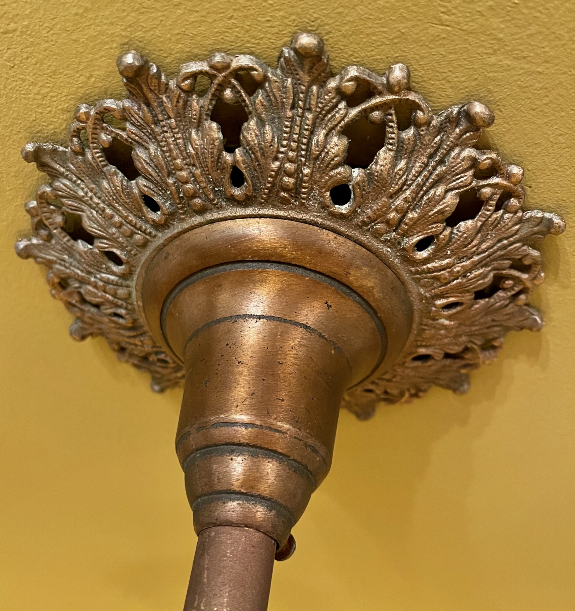 The ceiling canopies are also amazing. They have a lower vase, topped with a separate filigree piece. That the latter remains (on both fixtures!) is astonishing. Note, too, the gorgeous amber sphere finials! HOW are these still extant? Incredible.