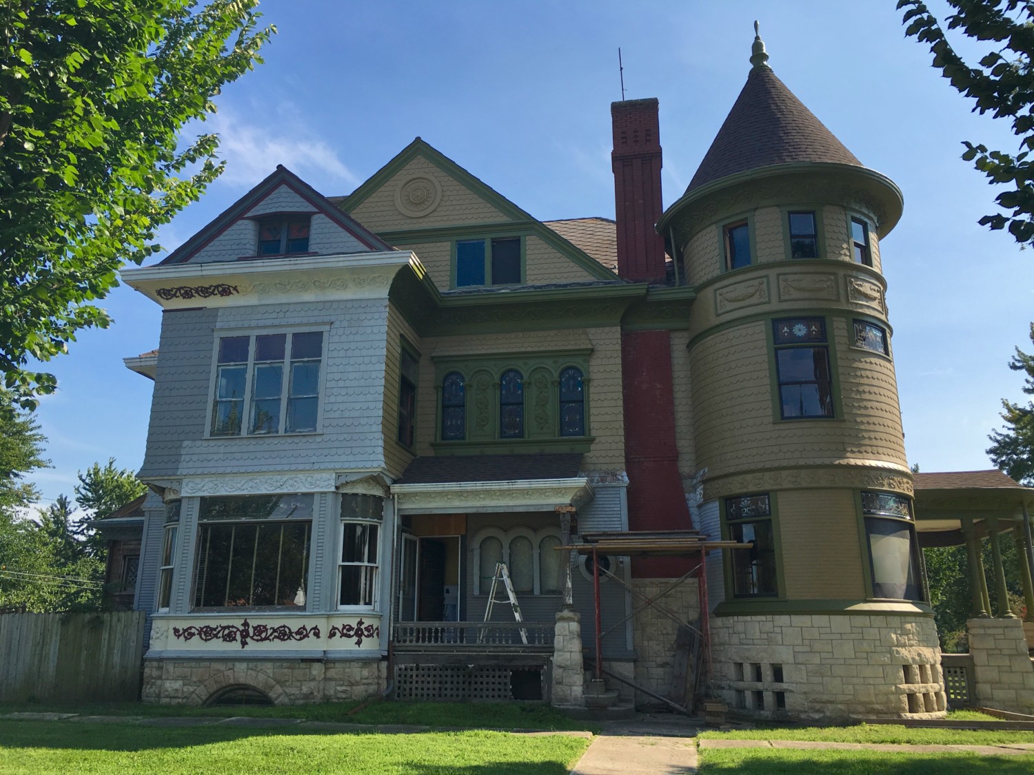 Yay! No more scaffolding! So much progress since that first picture you posted above – fence down, new paint, and SO many restored windows. It looks beautiful.