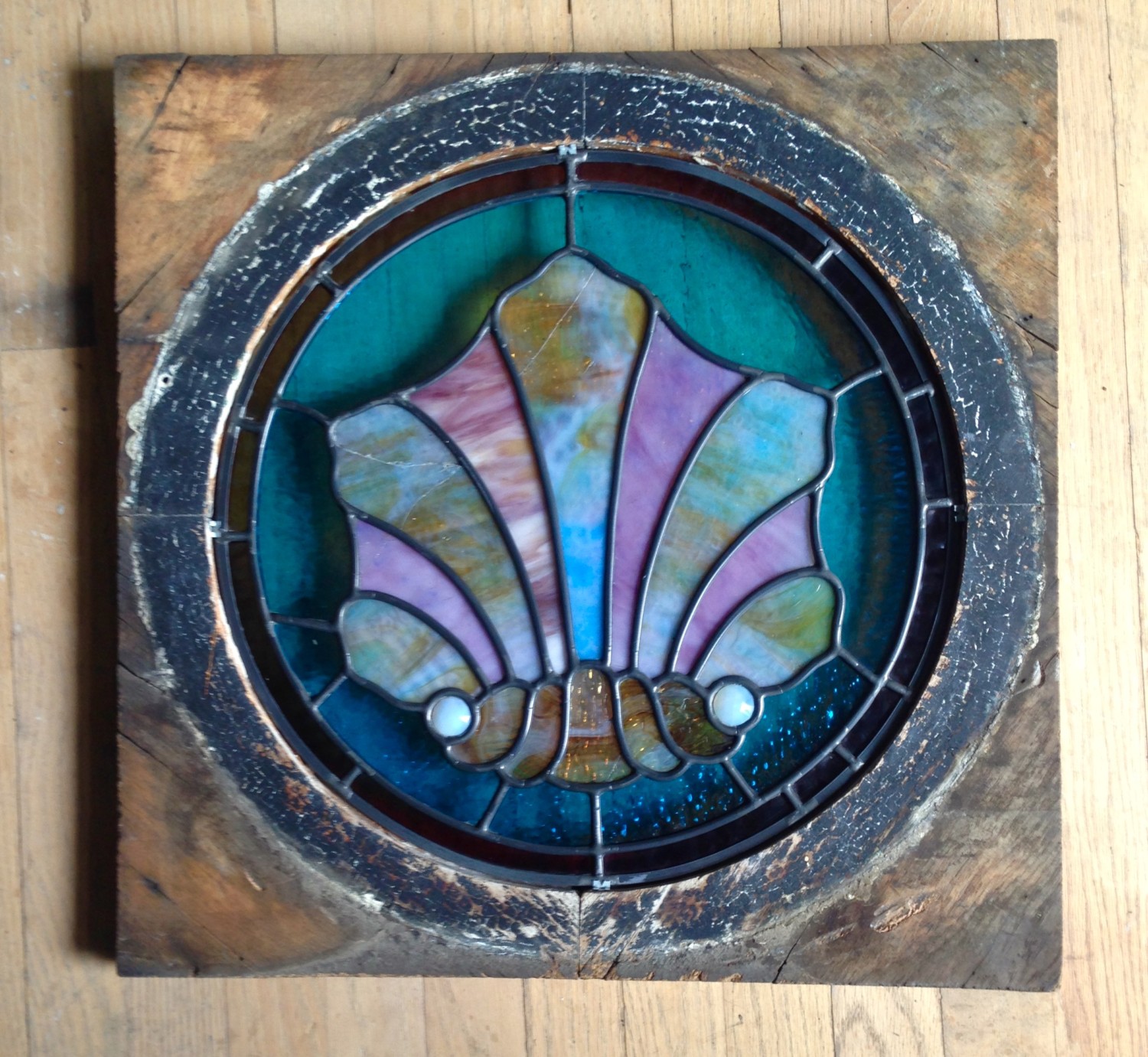 But this is no ordinary closet. One curious aspect is that it contains a round stained-glass window. There is also an operable transom window above the door, the only such feature in the whole huge house.