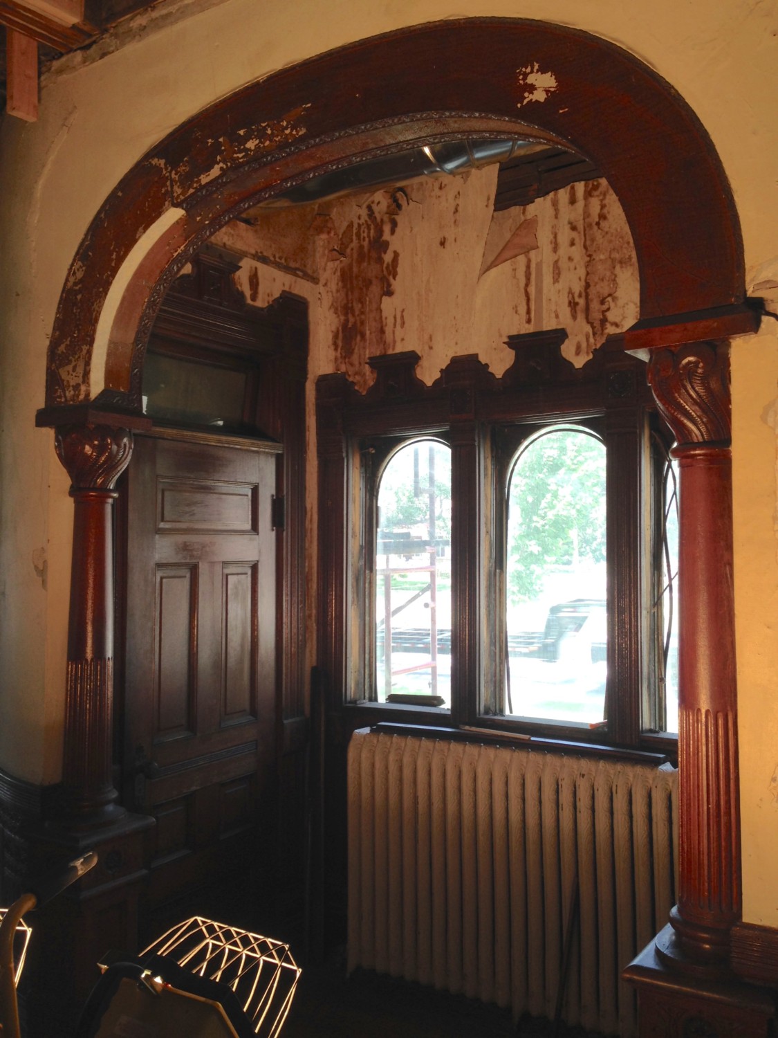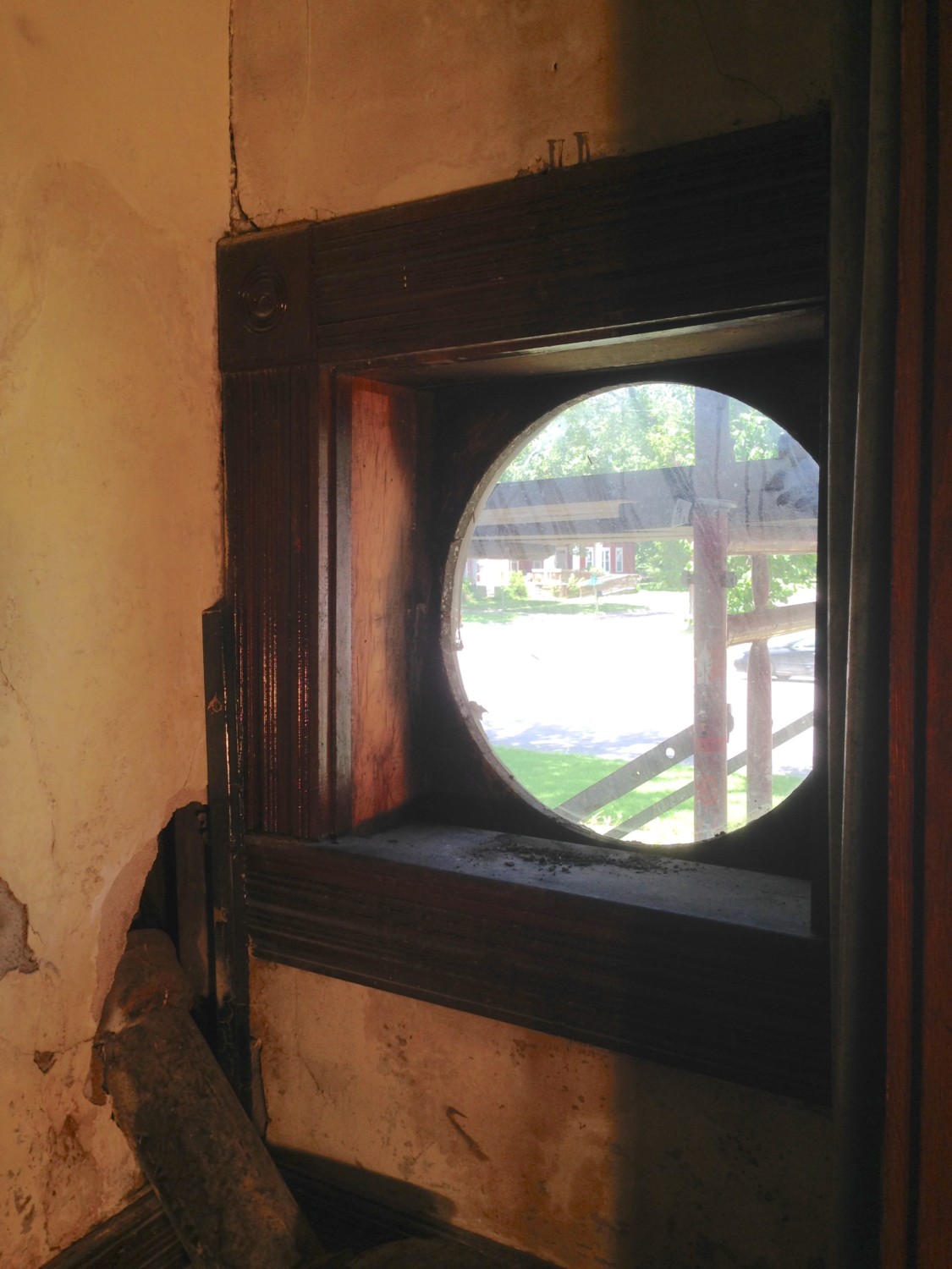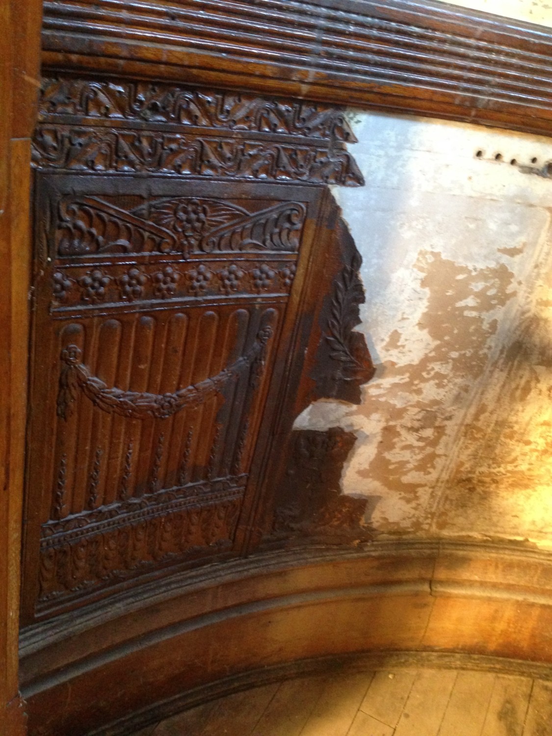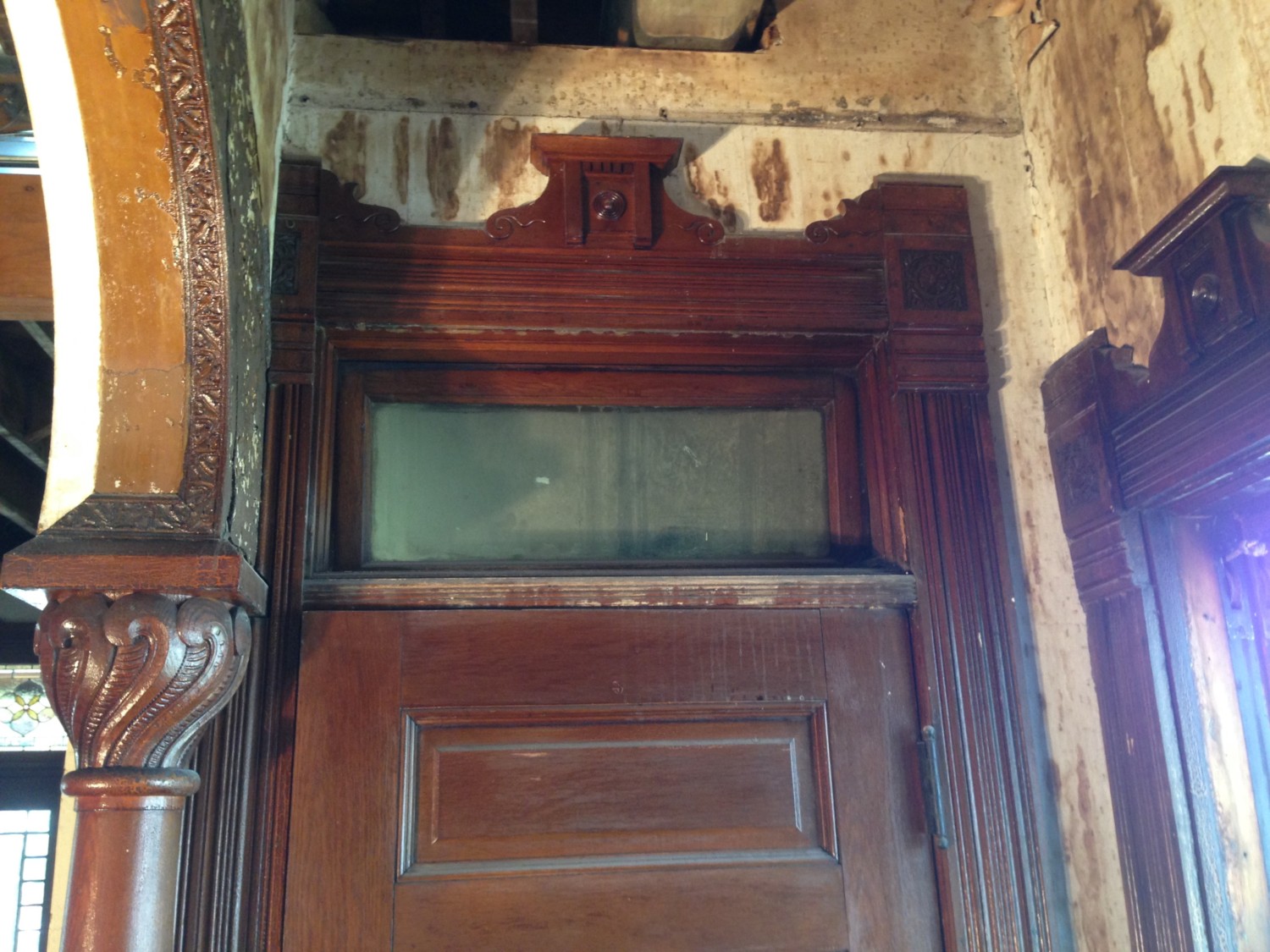 The niche. Looking poorly but still fabulous. The windows are stained-glass, but these have been removed for restoration. See the door?