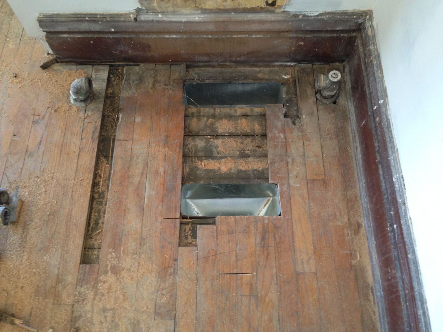 When the oak flooring was laid down, it was simply notched (none too well) around the legs of each radiator. Well, there is a limit to what I must tolerate! So, I am having proper wood installed under every damn radiator leg in the house, after having (sigh again) each radiator lifted by 3/4-inch. In the image above you see two ducts to the A/C. The one at the top was under the radiator, and this impeded the all-important air flow. And I do love good air flow. So I had the duct relocated (bottom). The salvaged flooring from the library will repair all this.