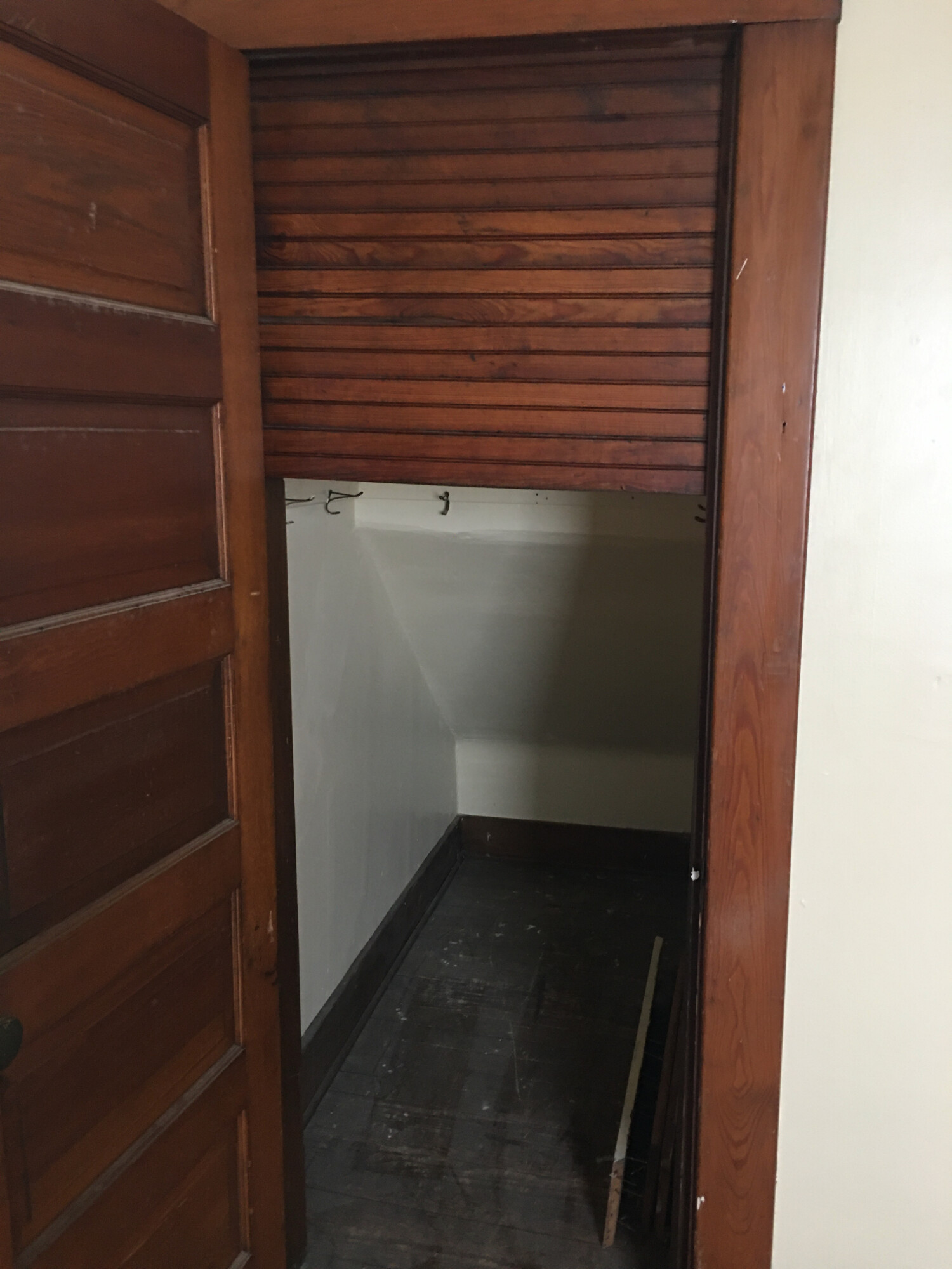 …in the carriage house, the Secret Bedroom closet door opens to a much reduced height. The beadboard is covering the stair landing. So, TALL door, LOWER aperture.