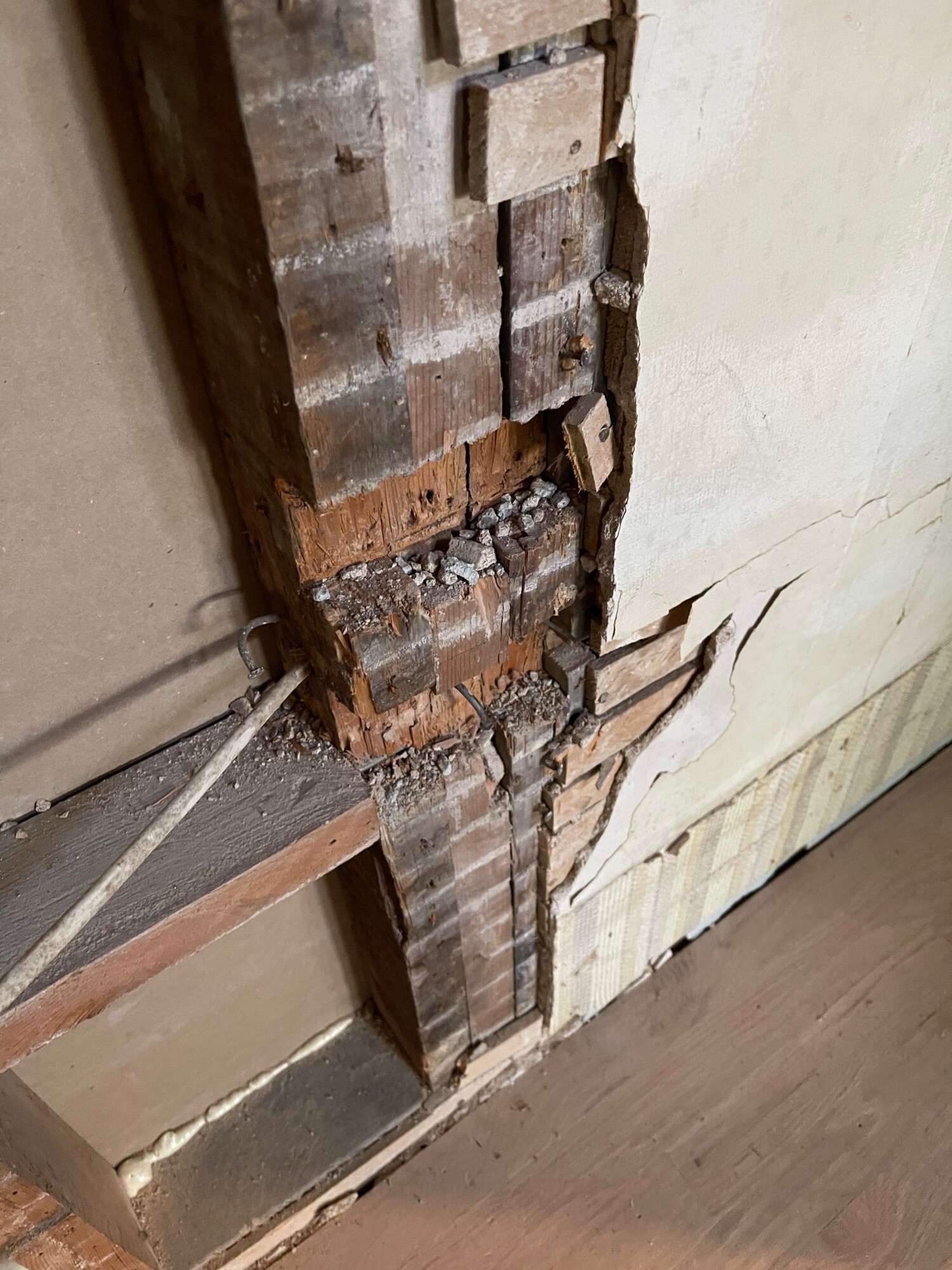 …are three studs. I do not know why they are hacked out. These triple studs are the original west support for the 1894 door header.