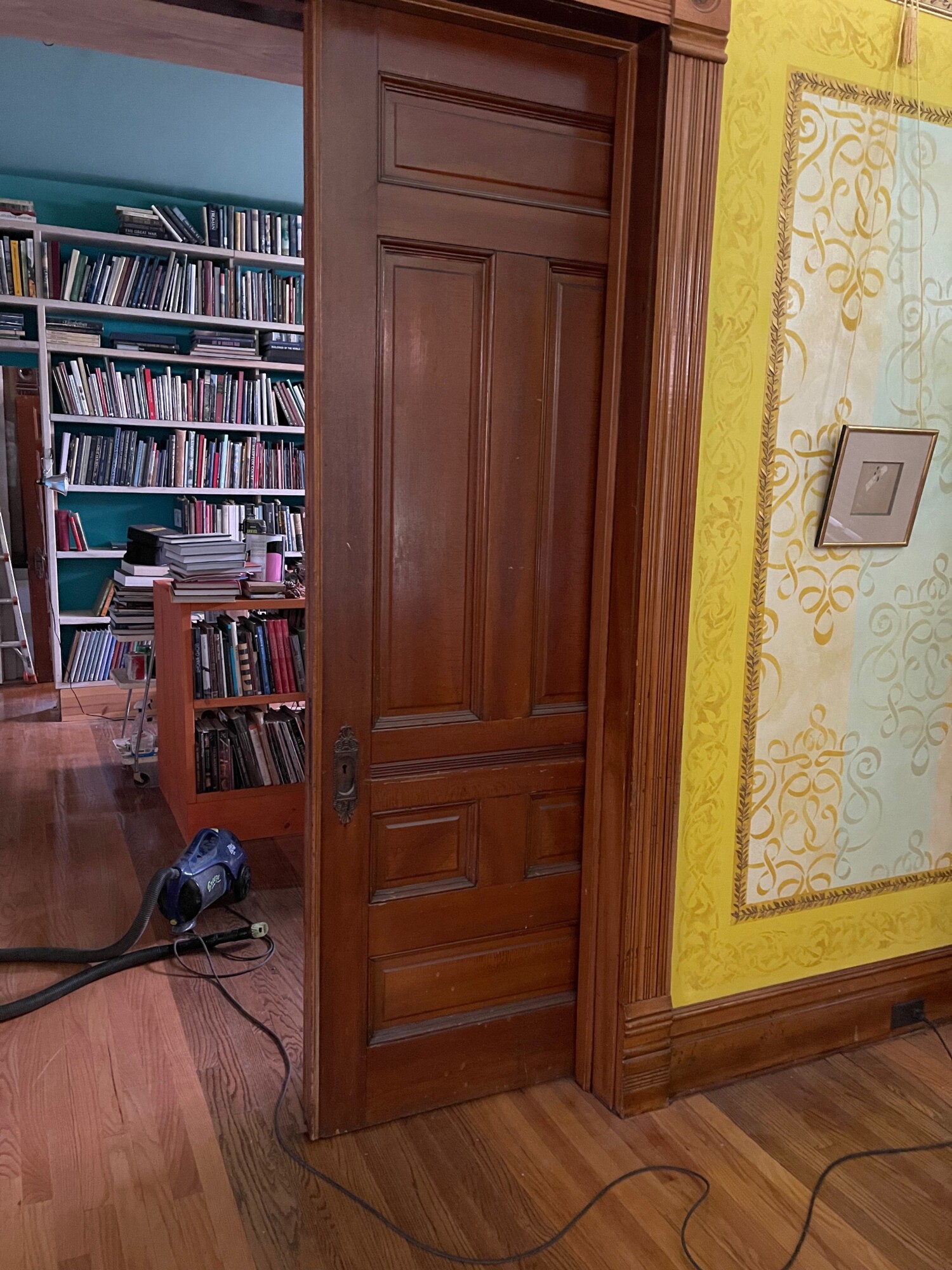 The architect ordered a pair of 8-foot-high pocket doors for the library. These are in situ.