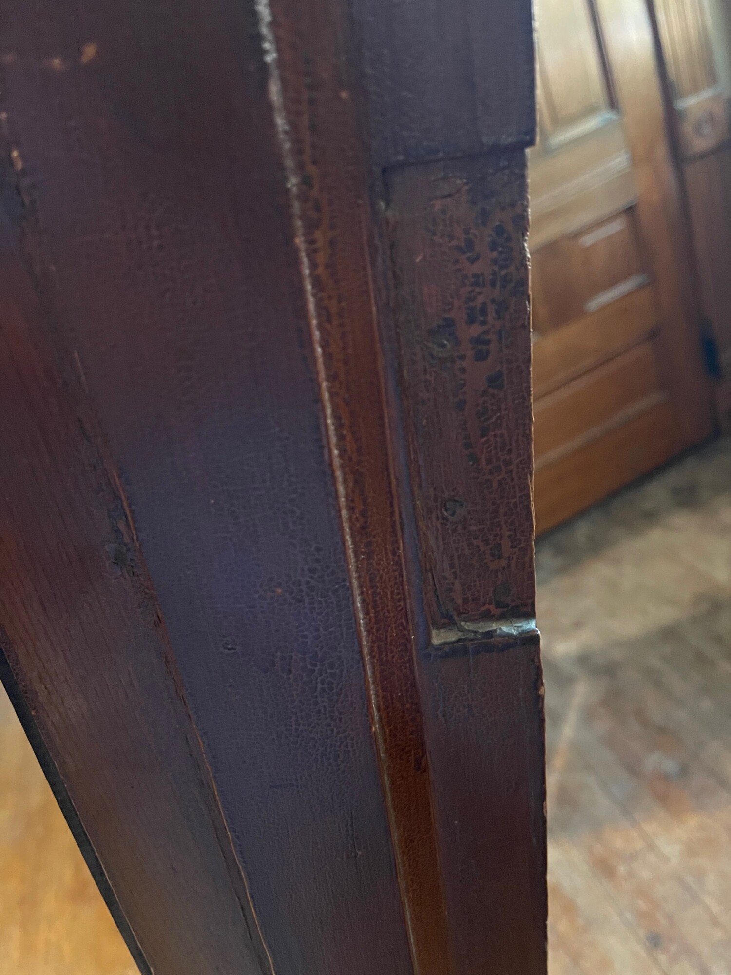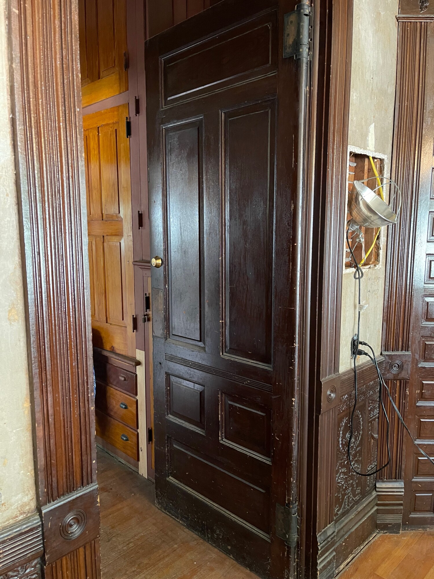 An 8-foot-high door would have looked odd. So, the 1894 frame was reduced in height, a 7-foot door from the kitchen (perhaps previously removed and stored away) was installed inside the newly reduced 1894 frame, and new hinge pockets cut out. And the 8-foot door? It is long gone.