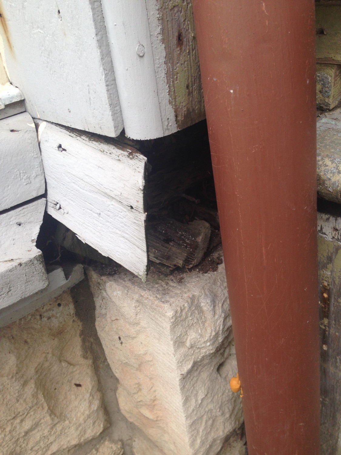 Which rotted the water table, and sill. This is bad. Very bad. So, last year we tacked on a section of downspout to get the damn rain away from the house. Not attractive, but effective.