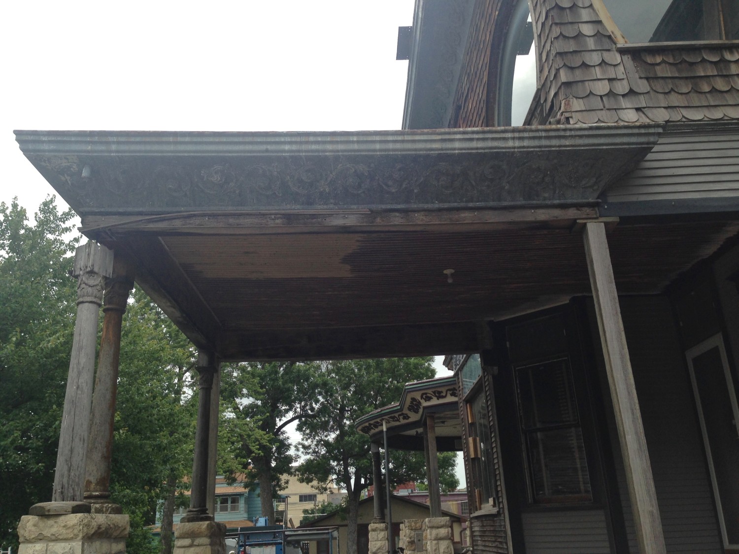 Over to the far right, the gutter is shallow to the point of not being a gutter. It is just, well, a shelf. And water drips onto the shelf, then trickles down the curved cornice, and onto the 4×4 wood column below. The column is a temporary replacement for the original turned column (with decorative capital), which is now mostly rotted and stored away.