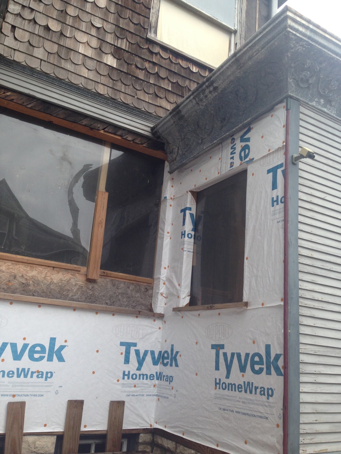 MOST of the water from the massive roof falls into the winding, contiguous north/east/south main gutter, where it all drained out a pipe (top, upper image). But without a downspout, it just slammed to the roof of the servant’s hall, destroyed all the wall shingles above the roof, and caused incredibly destructive havoc with the window and all other wood parts.