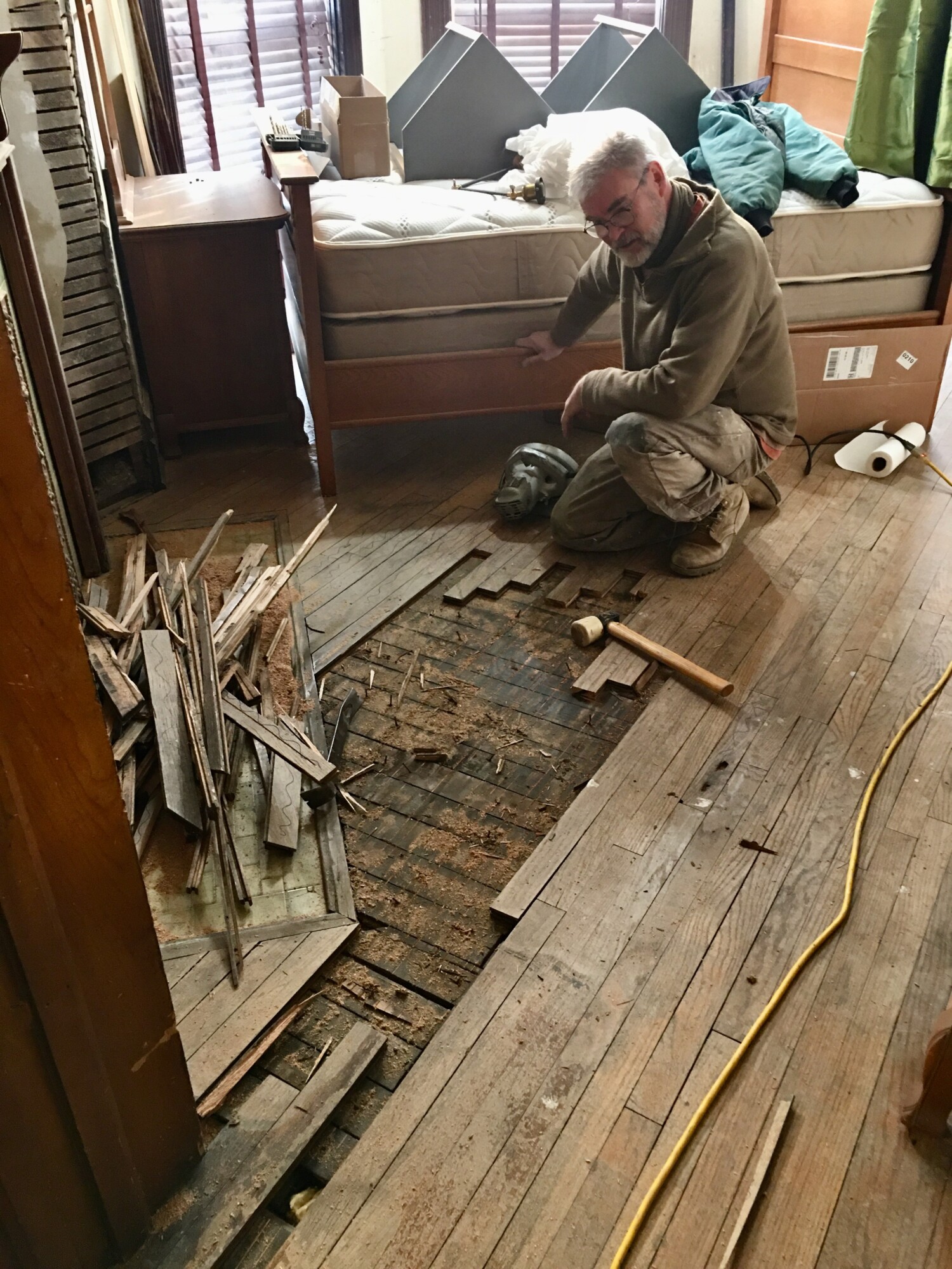 And there’s more. Much more. In the servant’s room in the SE corner, 3/4 of the flooring will be replaced. In the Long Bedroom, the original walk-in closet, later enlarged into a bathroom, lost all its flooring. It now has a new subfloor, and Justin will install new oak. When the work is complete, everything will look like nothing was done.