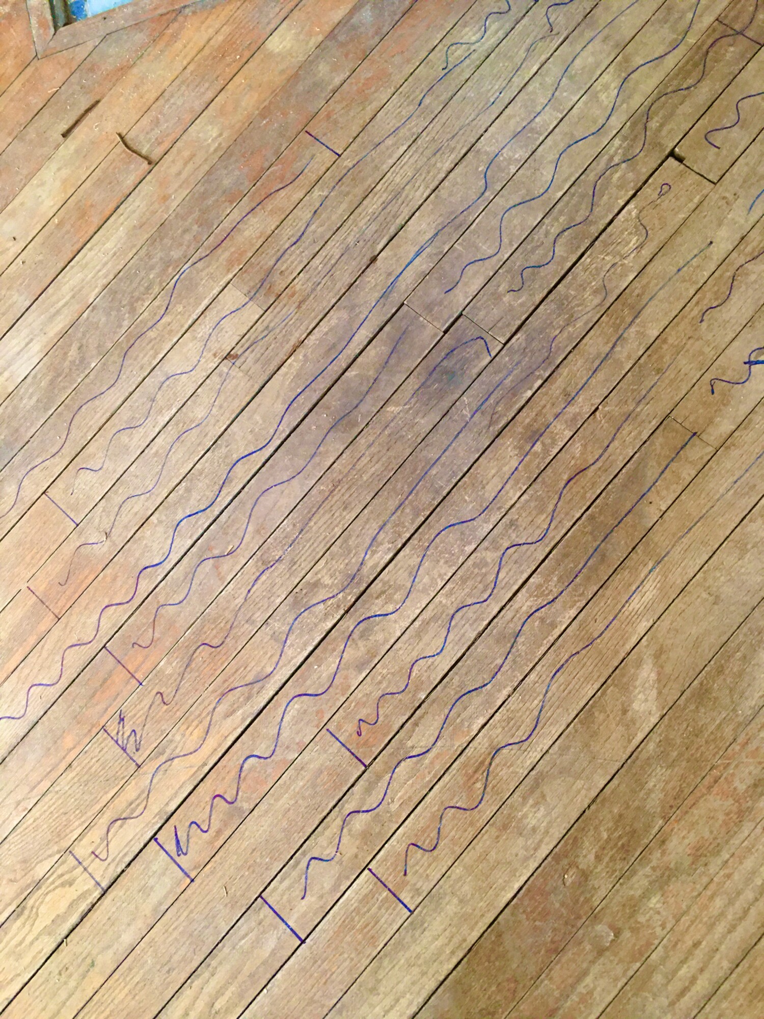 Also in the round bedroom, a persistent roof leak damaged the flooring in front of the hearth. Justin has tagged the oak which needs to be replaced.