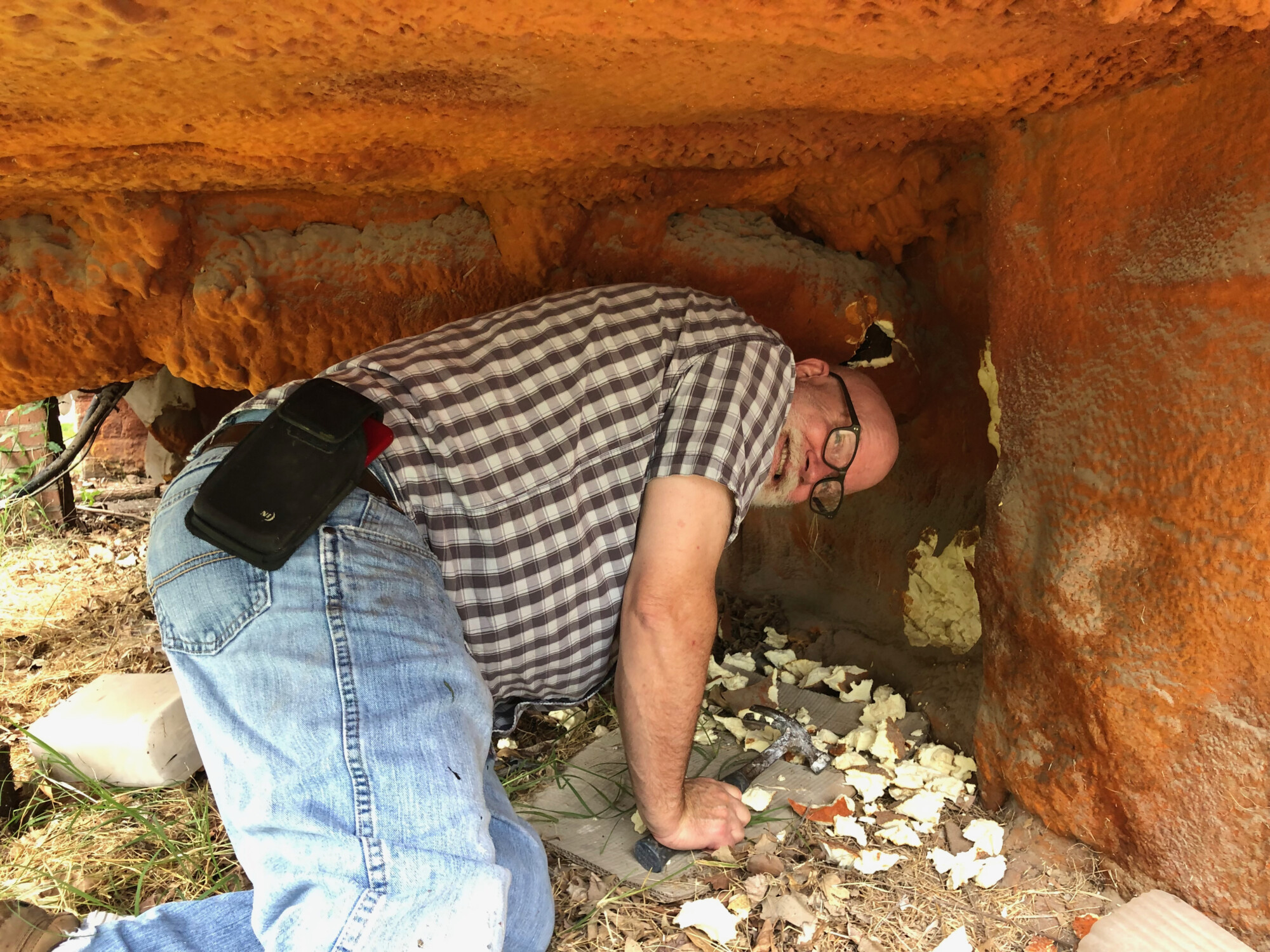 I needed to crawl under the south porch to chip away at the spray foam, in like 100-degree heat. Sooooooo not fun.