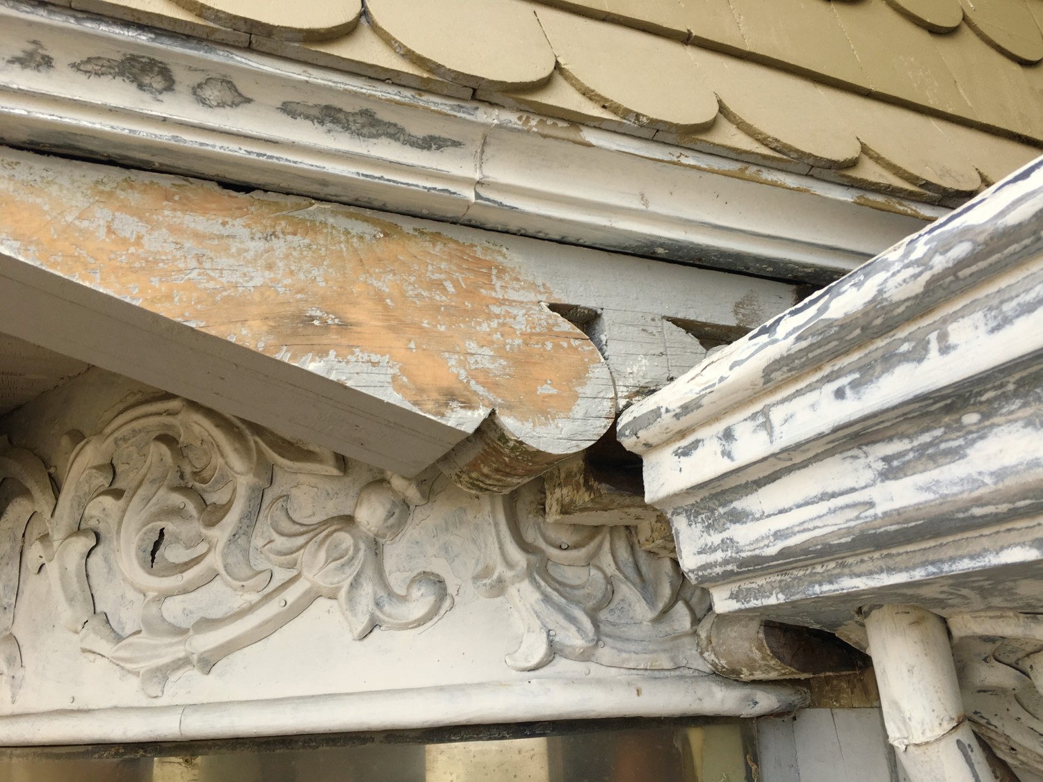Recently I did a post about the pair of double brackets above each of the curved-glass windows in the dining room. The brackets are in really good shape. Or so I thought.