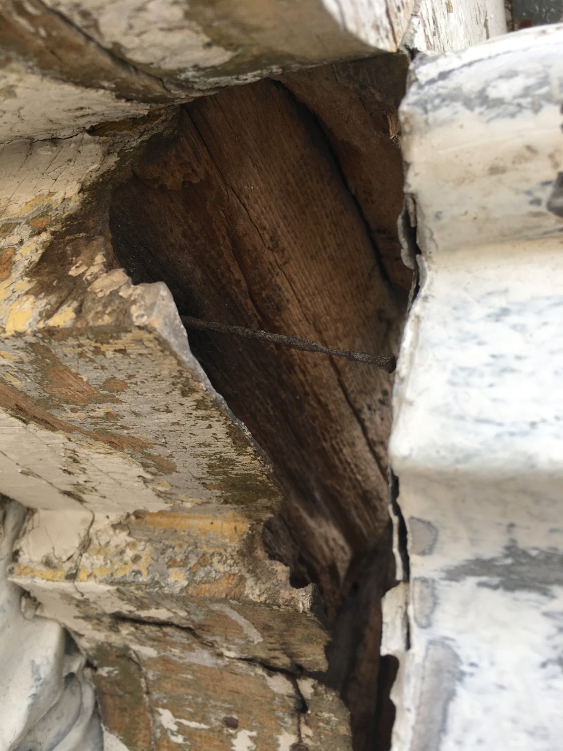 You can see how the end has just been hollowed out. Eek! Note the rusty nail at the top. There was once wood surrounding that nail!