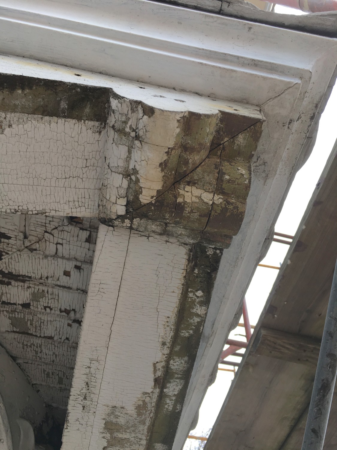 Last week I removed the dining room stained-glass windows for restoration. While doing so, an opportunity was afforded to take some close-up images! A pair of brackets visually hold up the second-floor, and this was a common detail for architect Charles Squires. There is another such bay on the south side. The petite ceiling is beautifully mitered beadboard.