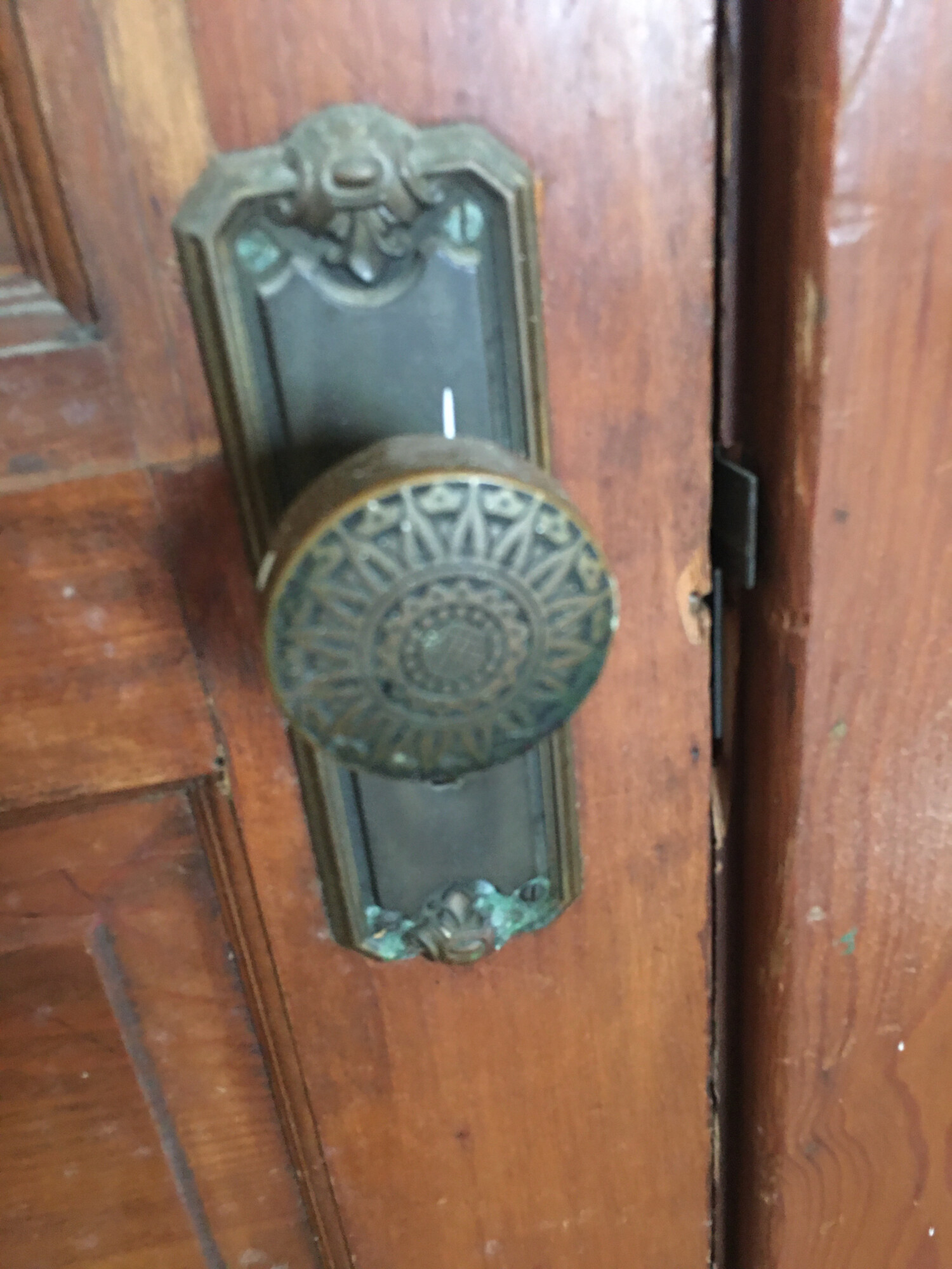 I did not have the fancy doorplates and knobs. They were all plain brass plated and corroded so I replaced the plates with newer lacquered brass plated plates and the knobs with glass reproductions. I have one skeleton key that fits all of the original mortised doors. I did manage to have a second made by a local locksmith. All except for the library. I bought a vintage set off of eBay, complete with mortised locks and a skeleton key. The entire house has mortised locks. The front door used to but it was replaced with a standard front door lock. Same with the kitchen door. I expect this happened in 1949.