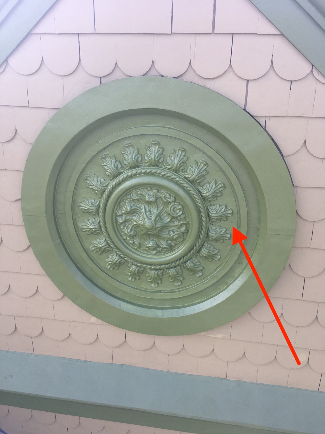 I think what is needed is for the flat area surrounding the acanthus leaves to be painted the wall color. This way, the center will look like a elaborate brooch clipped onto the house. Love the idea. But will it look good?