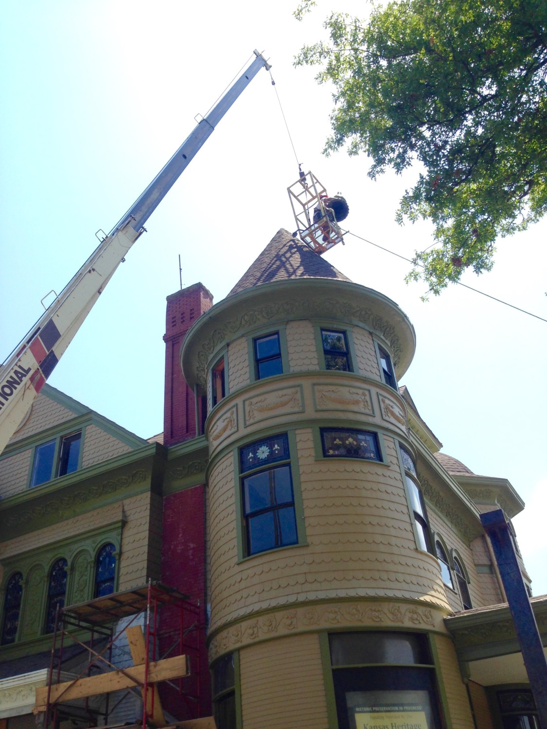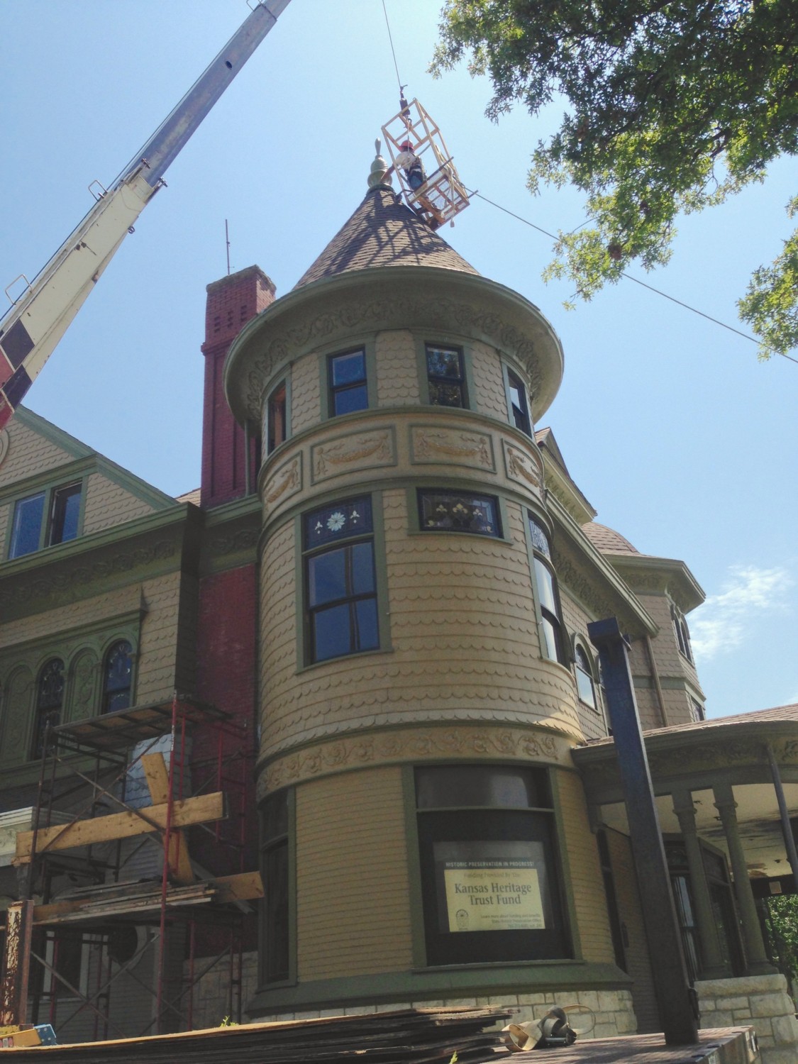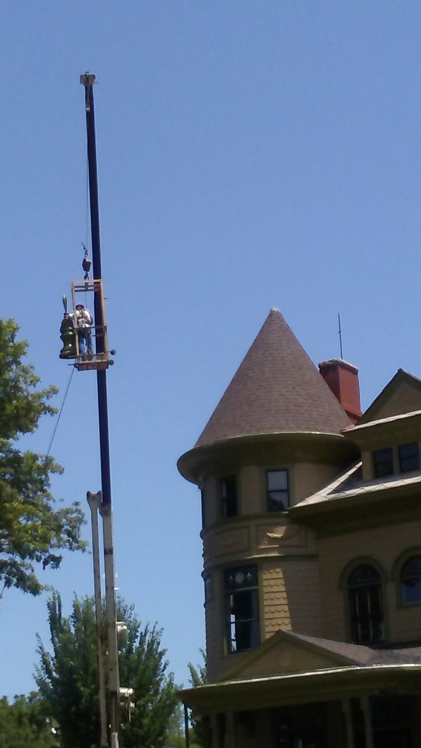 Look at the picture where Ross says the turret finial is flying. Then look at the two after that that reference Houston. I KNOW, right? I was repeating over and over “Don’t drop it. Don’t drop it. Don’t drop it…”. All extremely sotto voce so I didn’t add to Ross’ already fragile state. Of course, the Groh guys were the model of professionalism and performed flawlessly. Phew! I am embarrassed to say that if it had been dropped, I was all set to quietly get in my car and drive back to Wichita without looking back. I’m pretty sure my nerves would not have survived the ensuing trauma. And I know Ross has lots of local friends to help pick up the pieces–of the finial AND Ross!