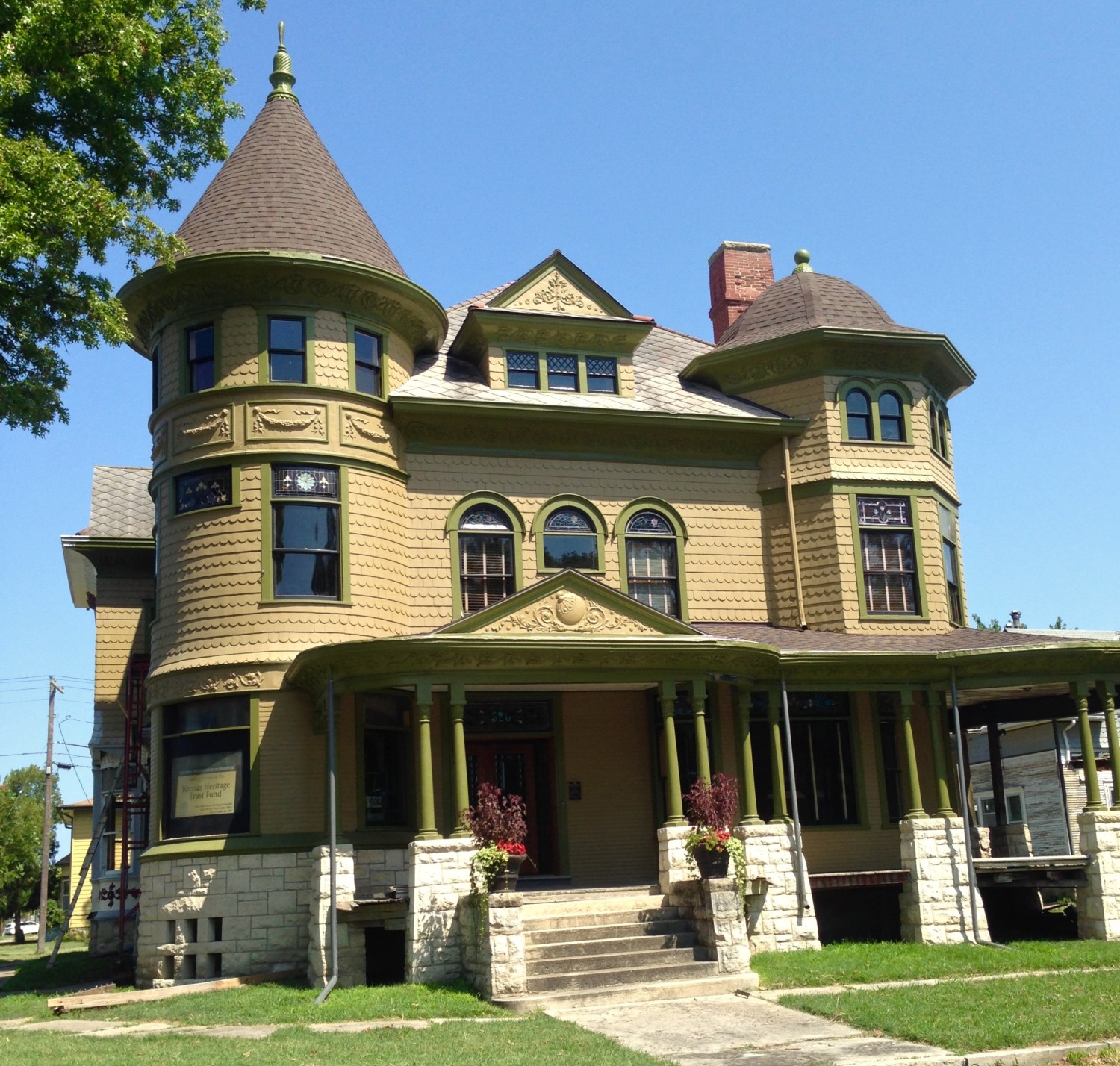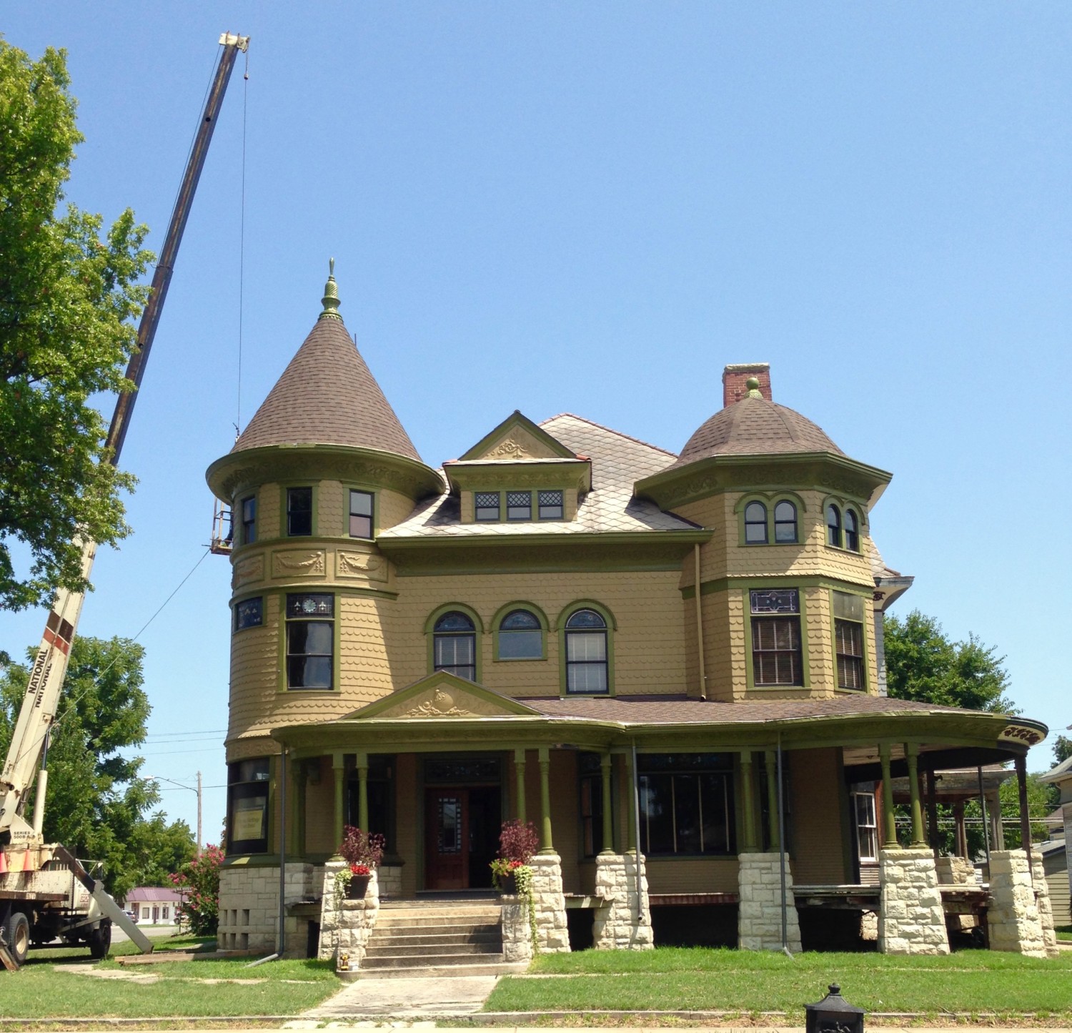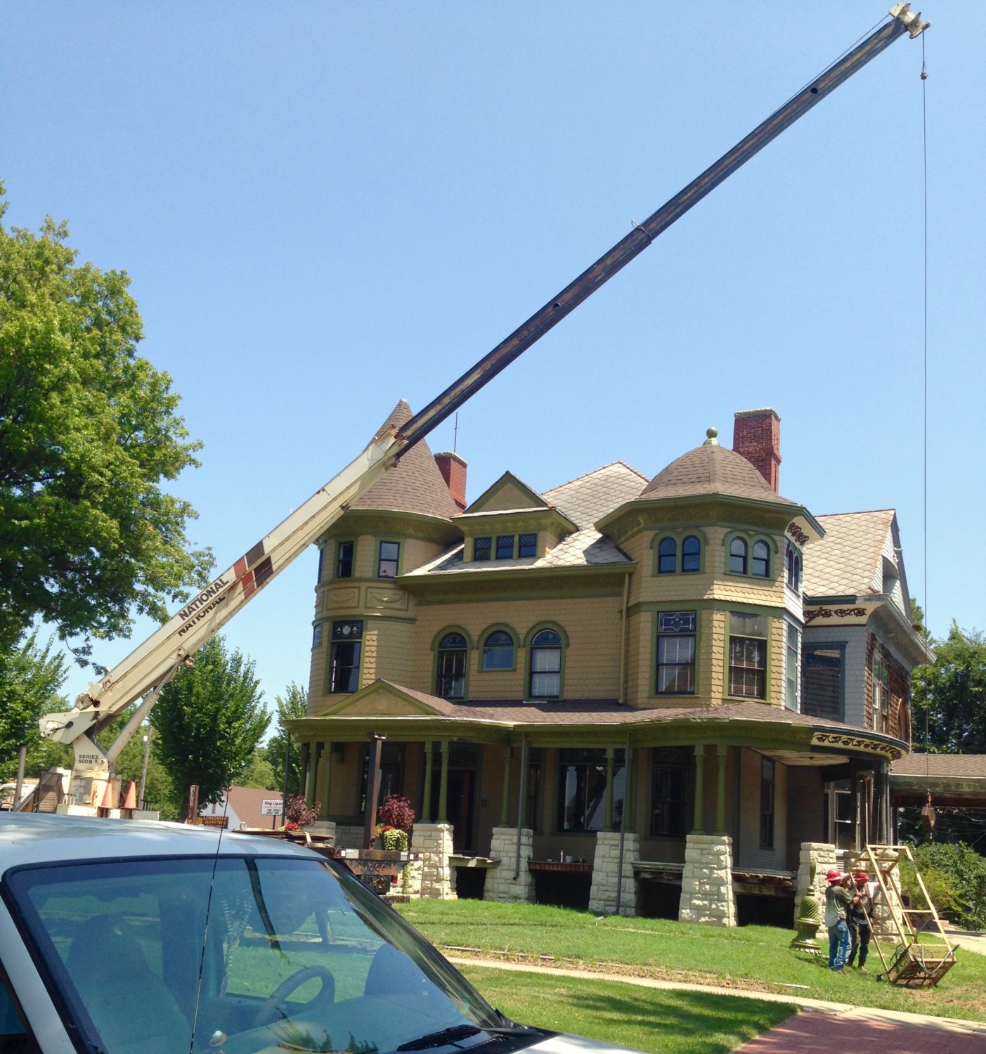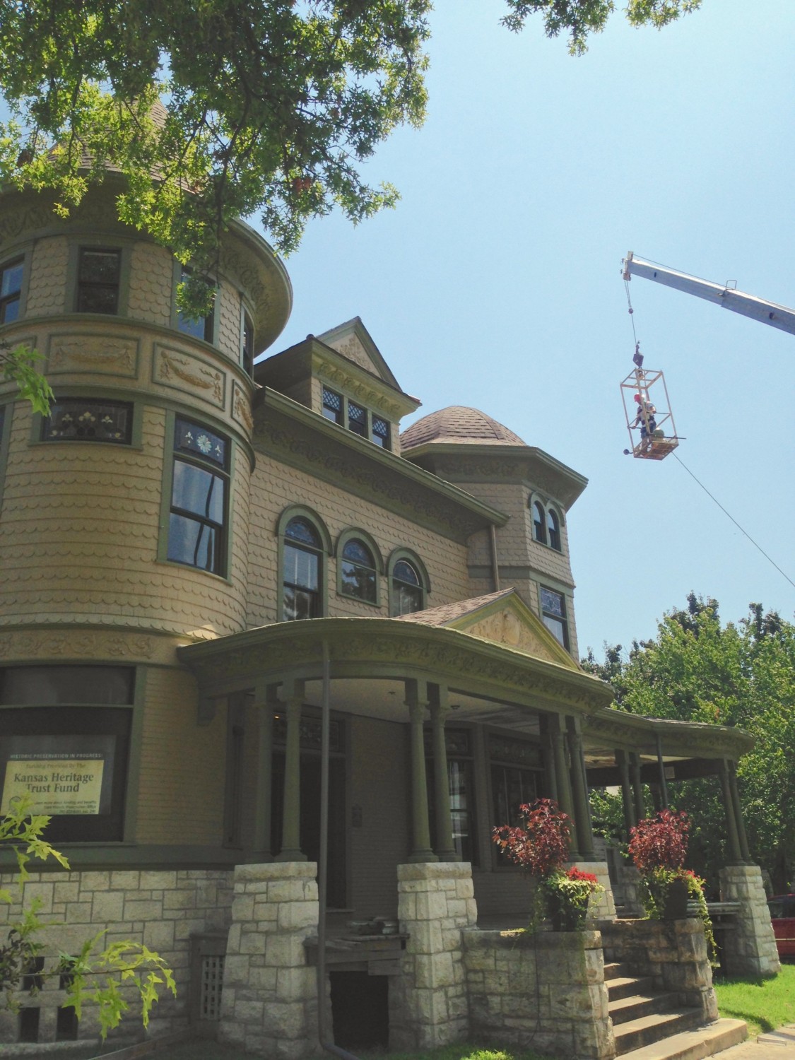 Look at the picture where Ross says the turret finial is flying. Then look at the two after that that reference Houston. I KNOW, right? I was repeating over and over “Don’t drop it. Don’t drop it. Don’t drop it…”. All extremely sotto voce so I didn’t add to Ross’ already fragile state. Of course, the Groh guys were the model of professionalism and performed flawlessly. Phew! I am embarrassed to say that if it had been dropped, I was all set to quietly get in my car and drive back to Wichita without looking back. I’m pretty sure my nerves would not have survived the ensuing trauma. And I know Ross has lots of local friends to help pick up the pieces–of the finial AND Ross!